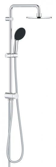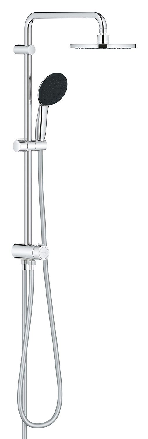 У наборі передбачено два душові шланги VitalioFlex Trend завдовжки 1500 та 1250 мм із різьбою 1/2" x 1/2", що спрощує монтаж і дає гнучкість під час підключення. Технологія GROHE SmartSwitch дає змогу поворотом диска обирати верхній або ручний душ, а також Eco-режим верхнього душу для зменшення витрати води. Система GROHE DreamSpray рівномірно розподіляє потік між форсунками, забезпечуючи комфортний струмінь за будь-якого режиму. Насадки SpeedClean дають змогу швидко видаляти вапняний наліт простим протиранням, а внутрішній охолоджуючий канал знижує нагрів корпусу та подовжує строк служби елементів. Силіконове кільце ShockProof зменшує ризик пошкоджень у разі падіння ручного душу.