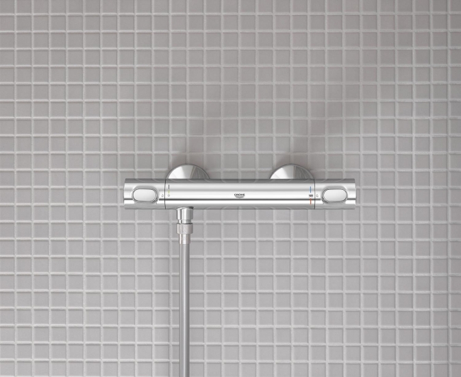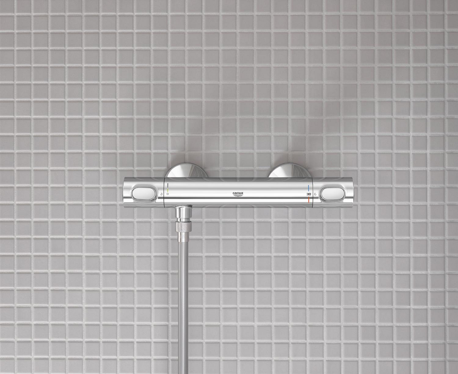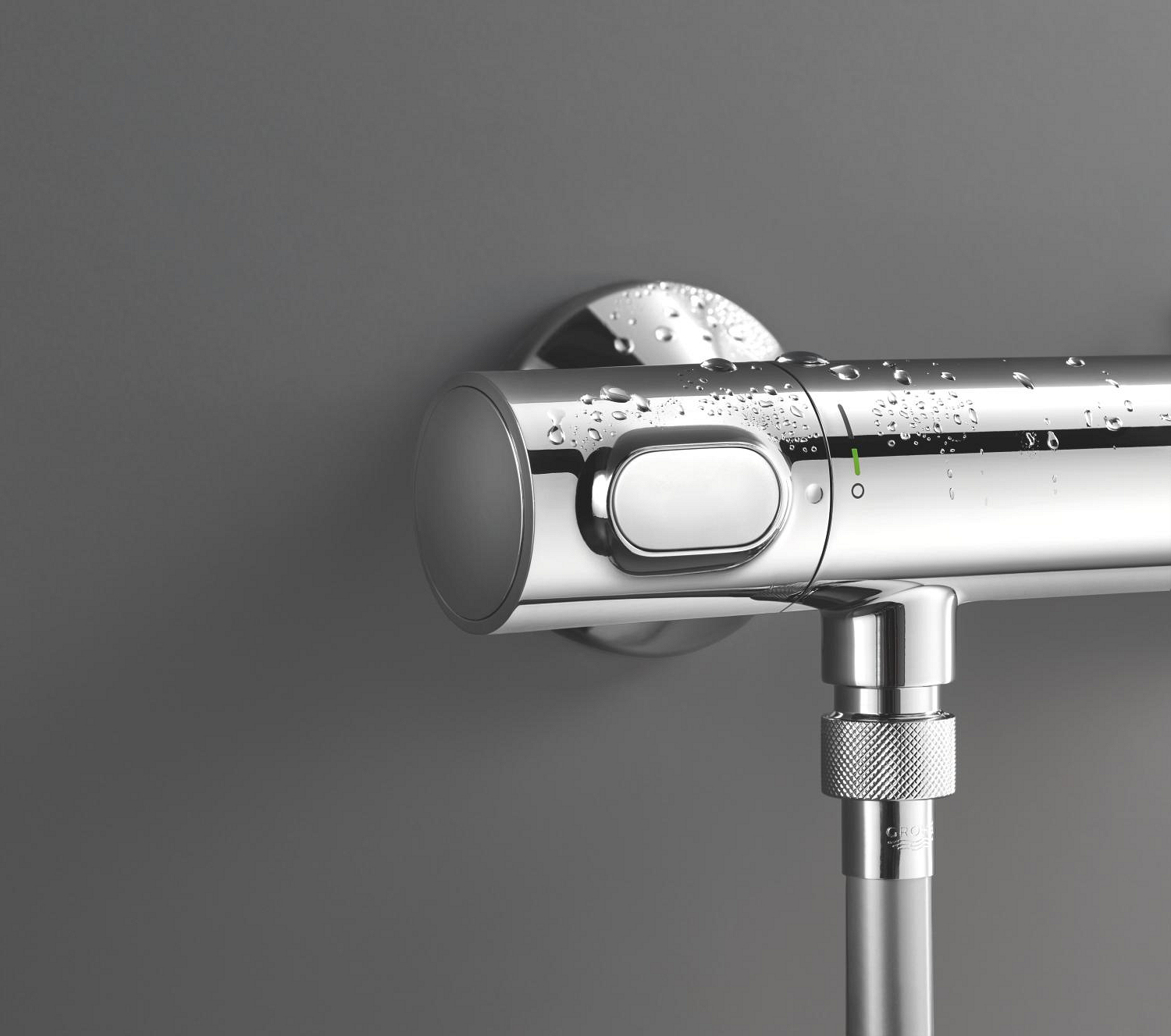 Термостатичний змішувач Precision Flow призначений для настінного монтажу та керує об’ємом і температурою води. Обмежувач GROHE SafeStop заводськи налаштований на 38 °C, а додаткова функція SafeStop Plus дає можливість обмежити температуру до 43 °C для підвищеної безпеки. Термостатичний картридж із восковим термоелементом швидко реагує на зміни тиску та температури в системі, підтримуючи стабільні умови під час душу. Рукоятка регулювання об’єму має функцію GROHE EcoButton, що дає змогу зменшити витрату води без втрати комфорту. Вбудовані зворотні клапани, фільтри для затримання бруду та захист від зворотного потоку підвищують надійність роботи.