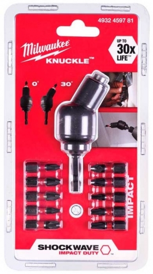 Набір біт Milwaukee Shockwave з насадкою Knuckle 1/4" 10 шт. (4932459781) — ударостійкий комплект для важкодоступних місць з поворотною насадкою, що дозволяє працювати під кутом до 30°. Включає 9 біт стандартної довжини 25 мм (PH2, PZ2, TX20, TX25, TX30) та магнітний тримач. Технологія Shockzone поглинає пікові навантаження, Wear Guard Tip захищає від зносу та вислизання. Сталь S2 з термічною обробкою забезпечує до 50× довший ресурс. Вага набору 0,25 кг, поставляється в пластиковому кейсі.