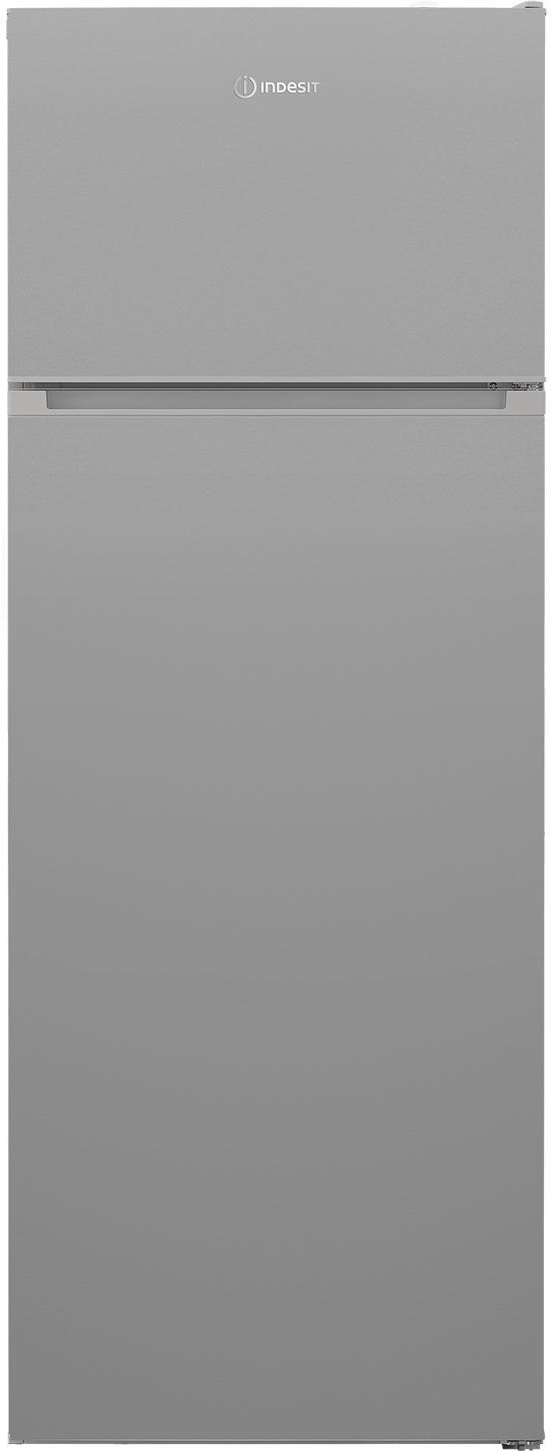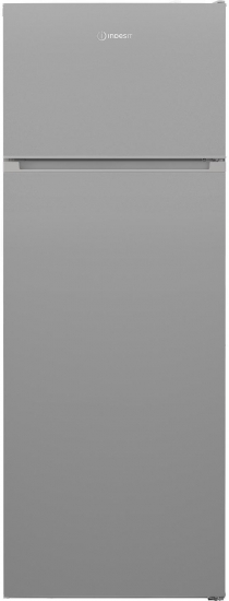 Indesit I55T1612S — компактний двокамерний холодильник сріблястого кольору з верхньою морозильною камерою для невеликих кухонь та сімей з 2–3 осіб.