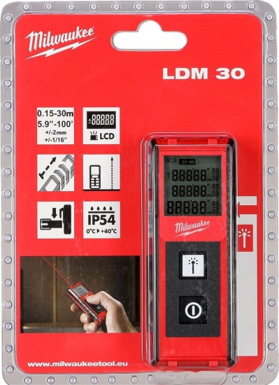 Лазерний далекомір Milwaukee LDM30 вимірює відстані 0,15–30 м з точністю ±2 мм та має просте керування “наведи й міряй”. Оснащений трирядковим LCD-дисплеєм із підсвічуванням та захистом IP54.