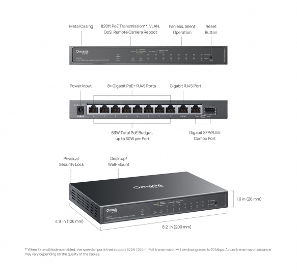 | Порти | 8 x RJ-45 10/100/1000 Мбіт/с /(підтримка 802.3af PoE та 802.3at PoE+) |