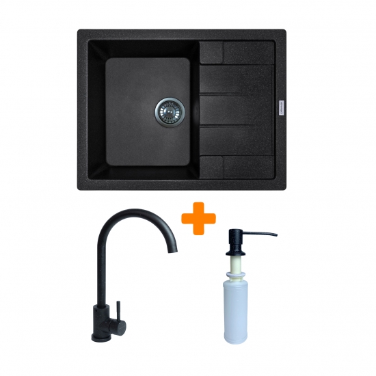 Опис Набір кухонний Adamant Anila, штучний камінь, прямокут., з крилом, 645х495х200мм, чаша - 1, врізна, чорний + змішувач та дозатор