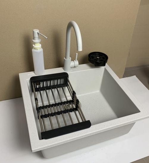Набір Adamant Univer – це продумане рішення, яке об’єднує мийку зі штучного каменю, змішувач, дозатор, ополіскувач склянок та коландер. Квадратна форма та конструкція без крила дозволяють раціонально використати простір на кухні. Технологія Solid Surface забезпечує високу міцність, стійкість до подряпин і зручність у догляді. Додаткові аксесуари роблять щоденну роботу комфортнішою та підтримують порядок у робочій зоні. Комплект створений для тих, хто цінує функціональність та сучасні матеріали.