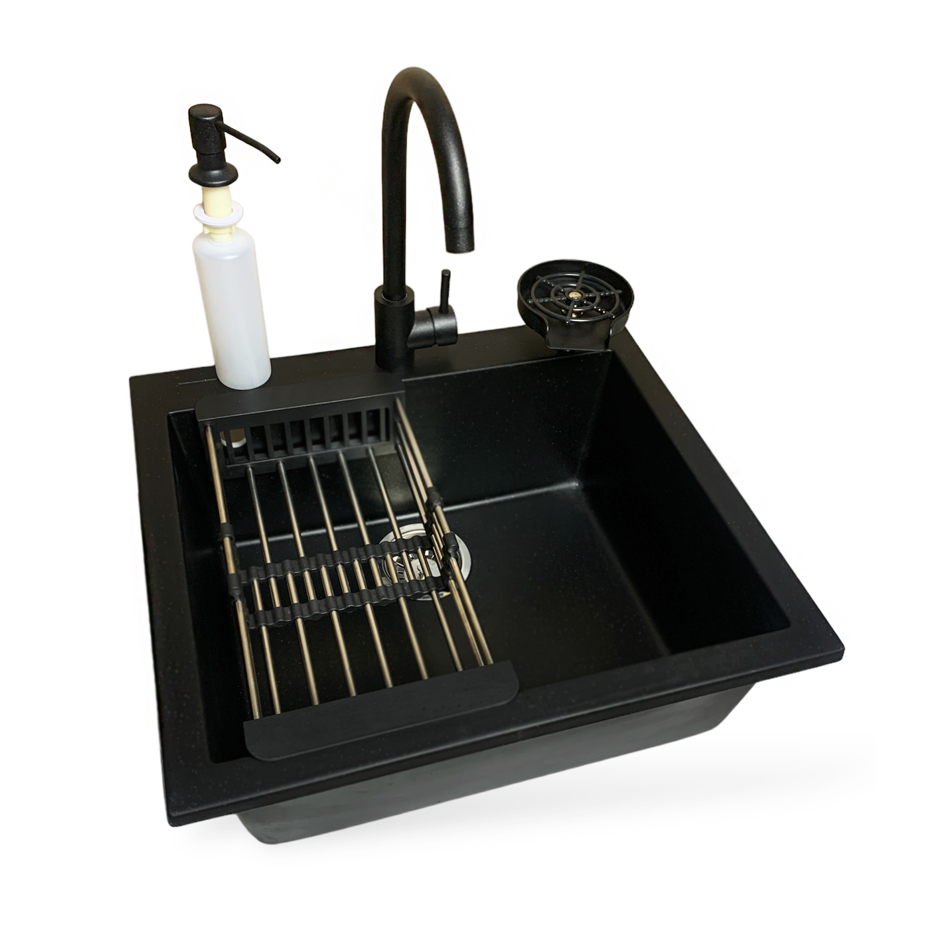 Набір кухонний Adamant Univer, штучний камінь, квадрат, без крила, 560х500х200мм, чаша - 1, врізна, антрацит + змішувач + дозатор + ополіскувач склянок + коландер