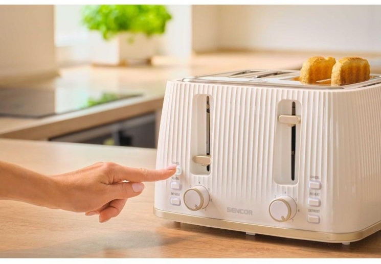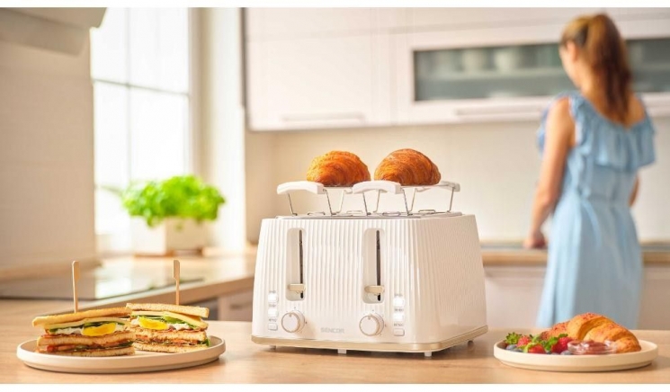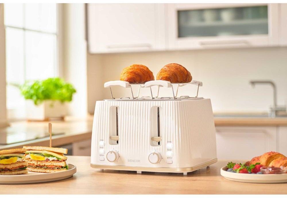 Sencor STS7540WH — потужний 4-слотовий тостер (1860 Вт) білого кольору з 7 рівнями підсмажування, функціями розморожування, підігріву та миттєвої зупинки. Знімна решітка для булочок, великий піддон для крихт і стильний світлий корпус. Ідеальний вибір для великої сім’ї або офісу — одночасно готує 4 тости.