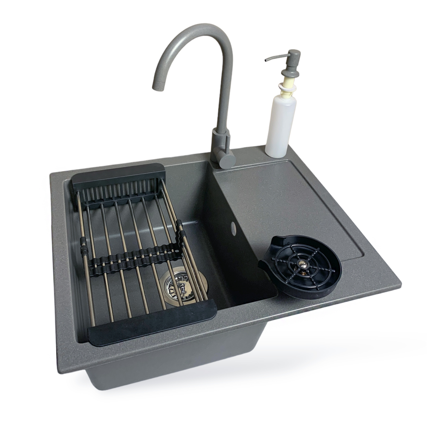 Набір кухонний Adamant Minimal, штучний камінь, прямокут., з крилом, 615х495х200мм, чаша - 1, врізна, сірий + змішувач + дозатор + ополіскувач склянок + коландер