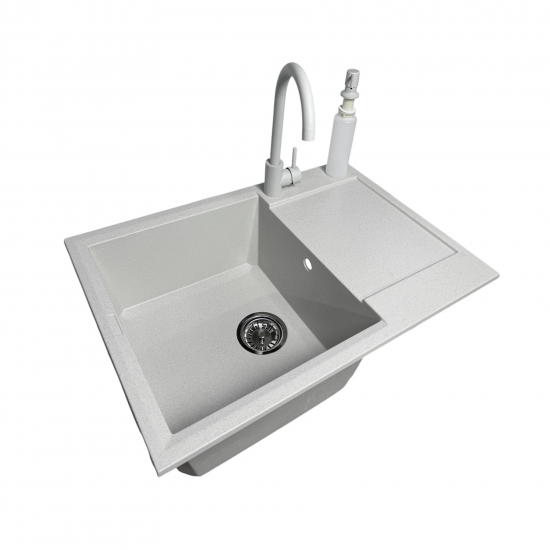 Кухонний набір Adamant Horizon Medium поєднує простору прямокутну мийку зі штучного каменю, змішувач та зручний дозатор. Глибока чаша та широке крило надають комфорт під час миття й підготовки продуктів. Матова поверхня зберігає охайний вигляд і легко очищується. Технологія Solid Surface забезпечує високу міцність та стійкість до впливів. Це універсальне рішення для сучасного та функціонального кухонного простору.