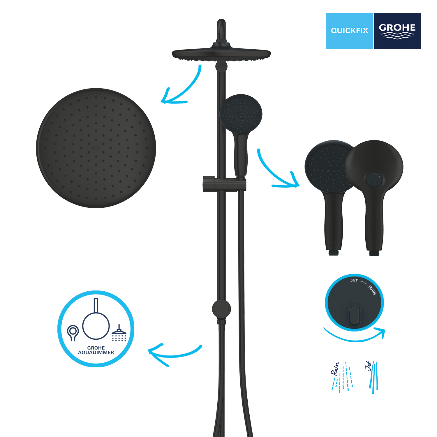 Душова система Grohe QuickFix Vitalio Comfort 250 поєднує верхній душ діаметром 250 мм у хромованому виконанні, ручну лійку Vitalio Comfort 110 з режимами Rain і Jet та одноважільний змішувач із керамічним картриджем SilkMove 46 мм. Технології DreamSpray, SpeedClean, WaterSaving, SmartSwitch, ShockProof, Inner WaterGuide і TwistStop забезпечують рівномірний потік води, зручне керування режимами, легкий догляд та стабільну роботу системи. Регульована по висоті рейка дає змогу змонтувати систему на вже наявні отвори у стіні.
