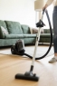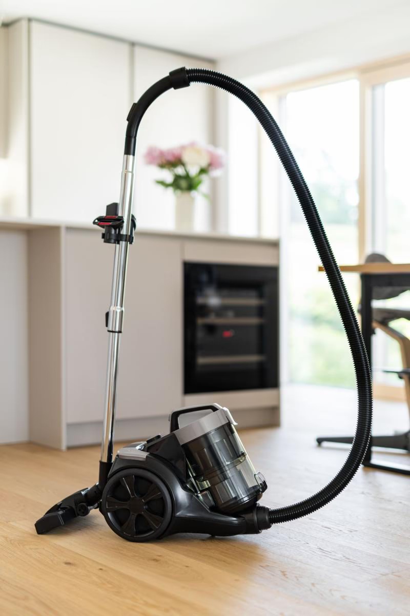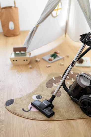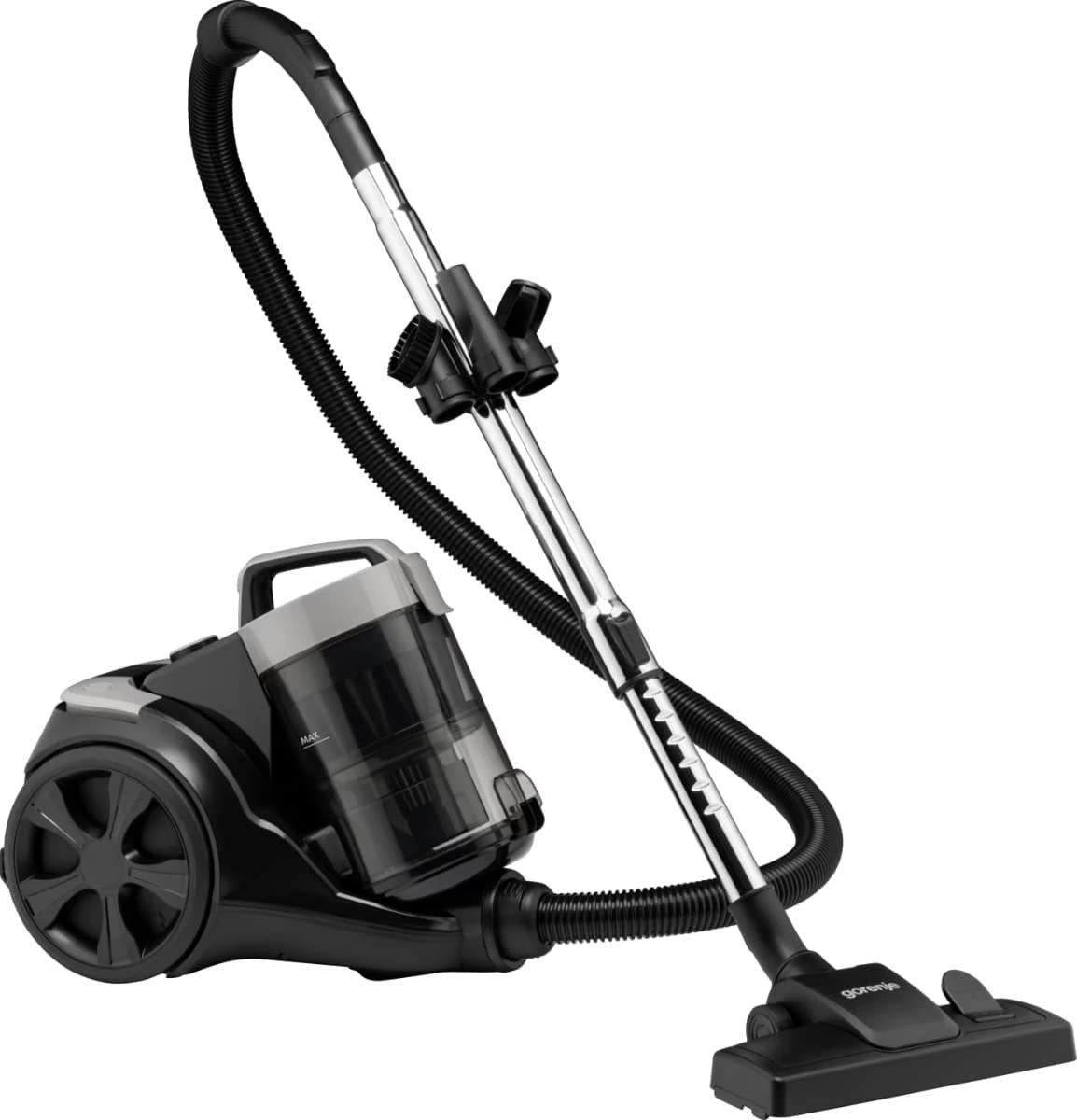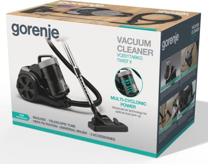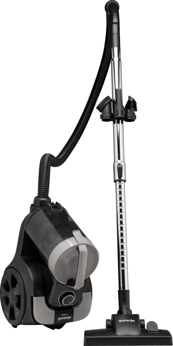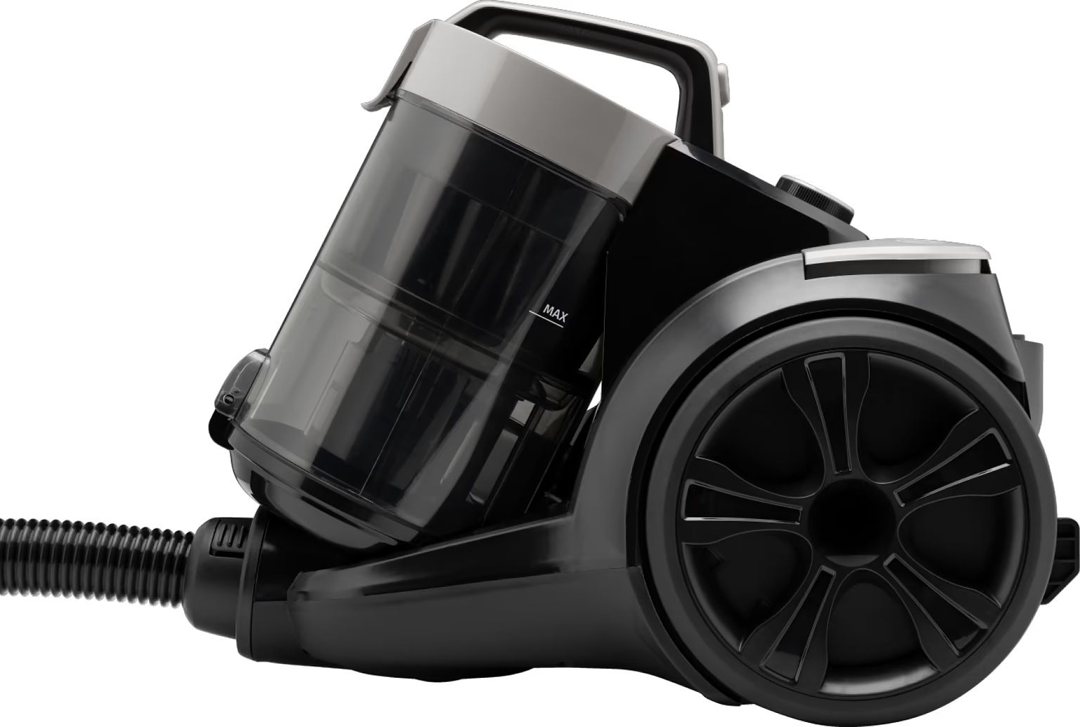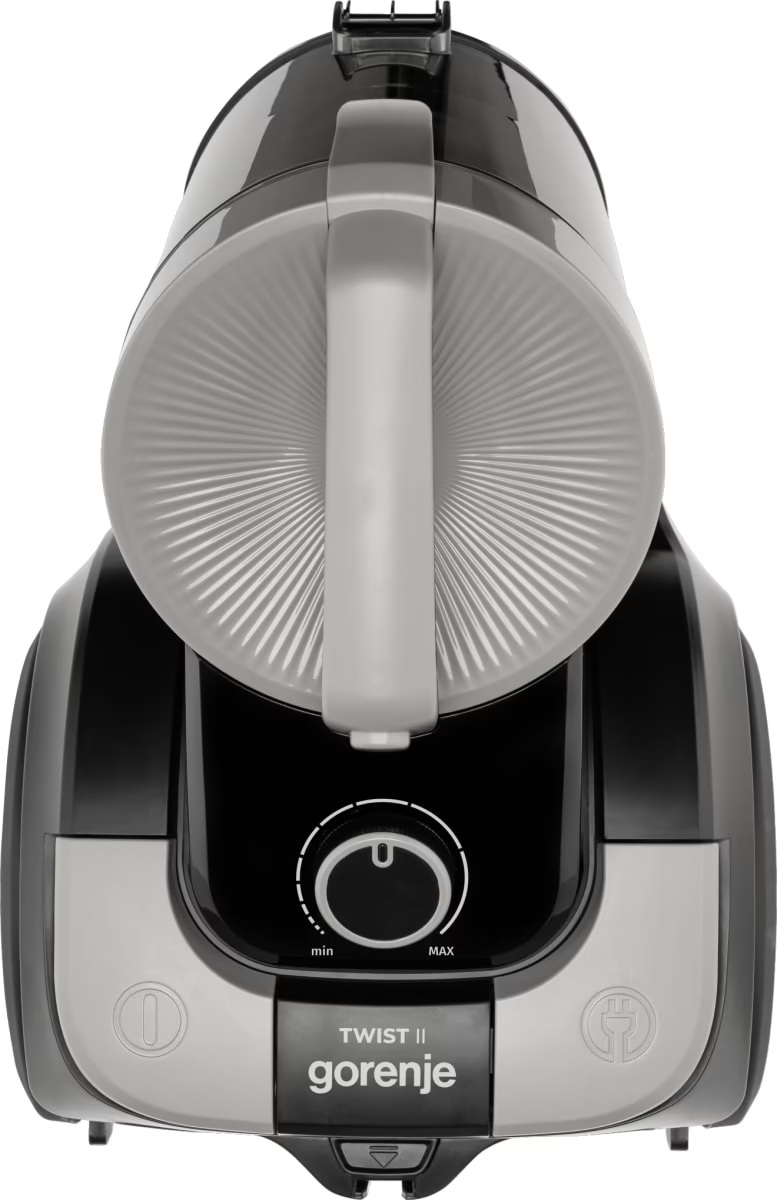 Пластиковий контейнер об’ємом 3,3 л легко виймається та очищується. Телескопічна трубка регулюється для роботи в просторих і компактних кімнатах. Поворотна ручка сприяє комфортному втриманню пилососа під час переміщення. Індикаторів немає, але огляд контейнера дозволяє оцінити рівень наповнення. Захист від механічних ударів забезпечують гумові колеса та збалансована конструкція. Радіус дії 7 метрів підходить для прибирання невеликих і середніх кімнат.