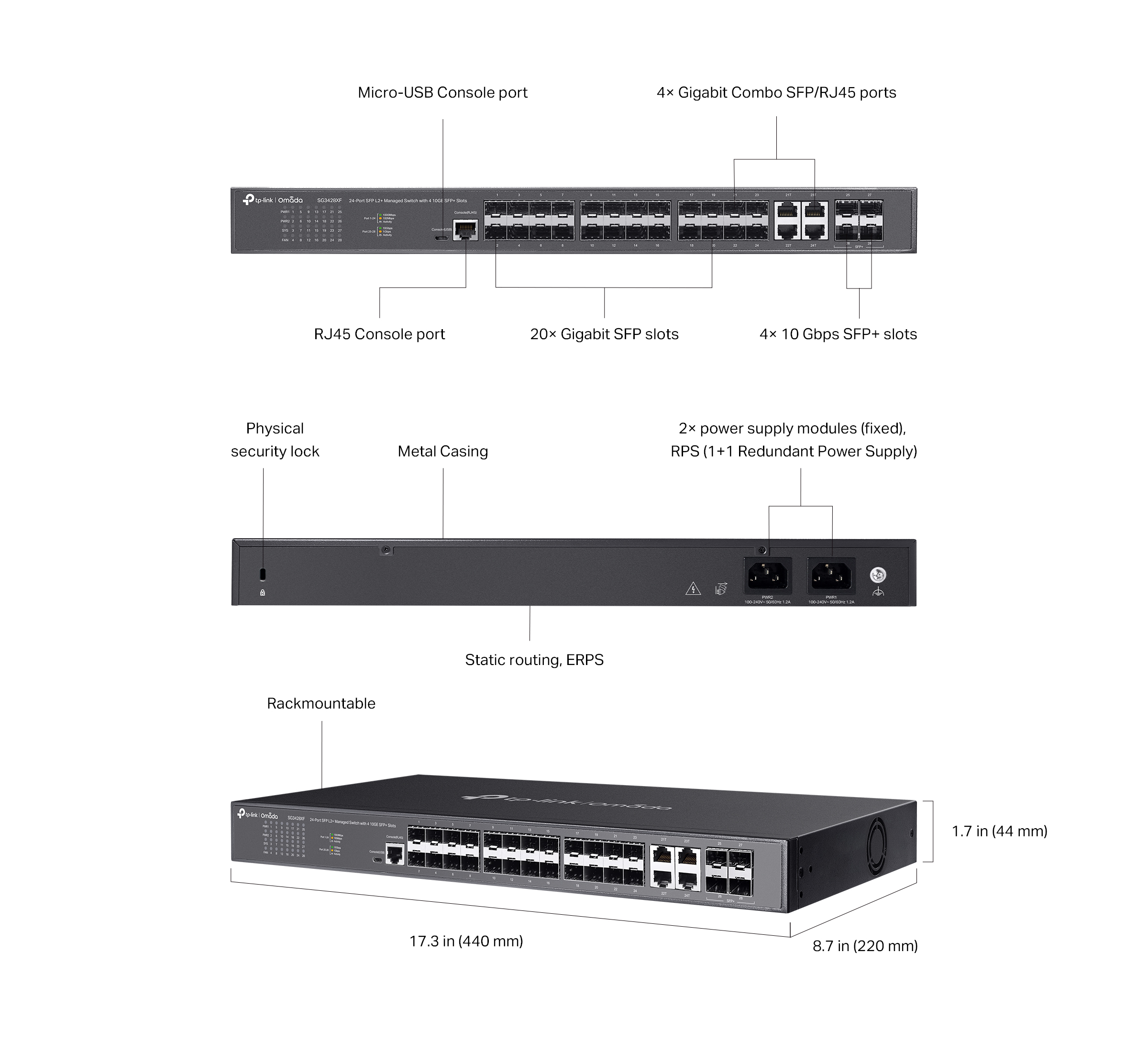 TP-LINK SG3428XF поєднує в собі велику кількість SFP-інтерфейсів та високошвидкісні 10G uplink-порти, що робить його гнучким рішенням для побудови оптоволоконної інфраструктури. Комутатор підтримує резервування живлення, забезпечуючи стабільність для критичних застосувань. Завдяки Omada SDN доступне централізоване управління, а також автономна робота через веб-інтерфейс, CLI та SNMP. У пристрої реалізовані можливості статичної маршрутизації, розширені інструменти QoS, VLAN та захисту трафіку. Модель підходить для проєктів, де важливі масштабованість і контроль на кожному рівні мережі.