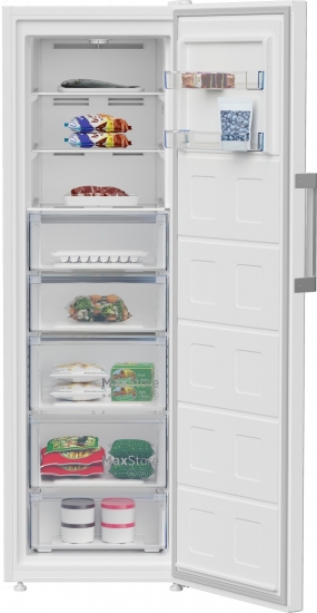 Морозильна камера Beko B1RFNE294W — вертикальний пристрій білого кольору з корисним об’ємом 260 л та класом енергоефективності E. Інверторний компресор ProSmart забезпечує стабільну роботу, а технологія No Frost усуває потребу в ручному розморожуванні. Дверцята з можливістю перенавішування та сигналом відкритого положення полегшують доступ до вмісту. Чотири ящики з загартованого скла та лоток для льоду з кришкою дозволяють систематично зберігати продукти. Розміри 170,5 × 59,7 × 70,9 см роблять пристрій зручним для стандартних кухонь.