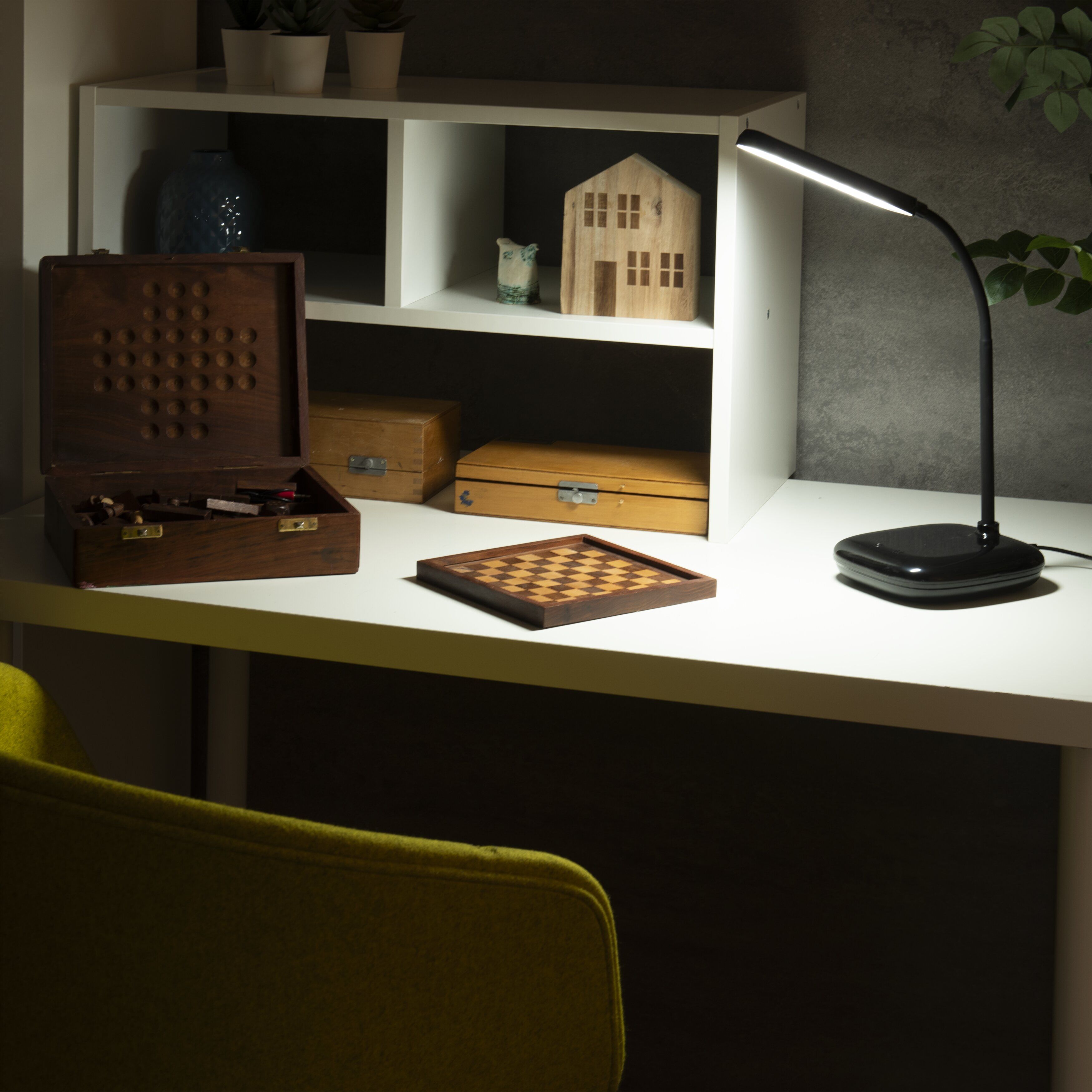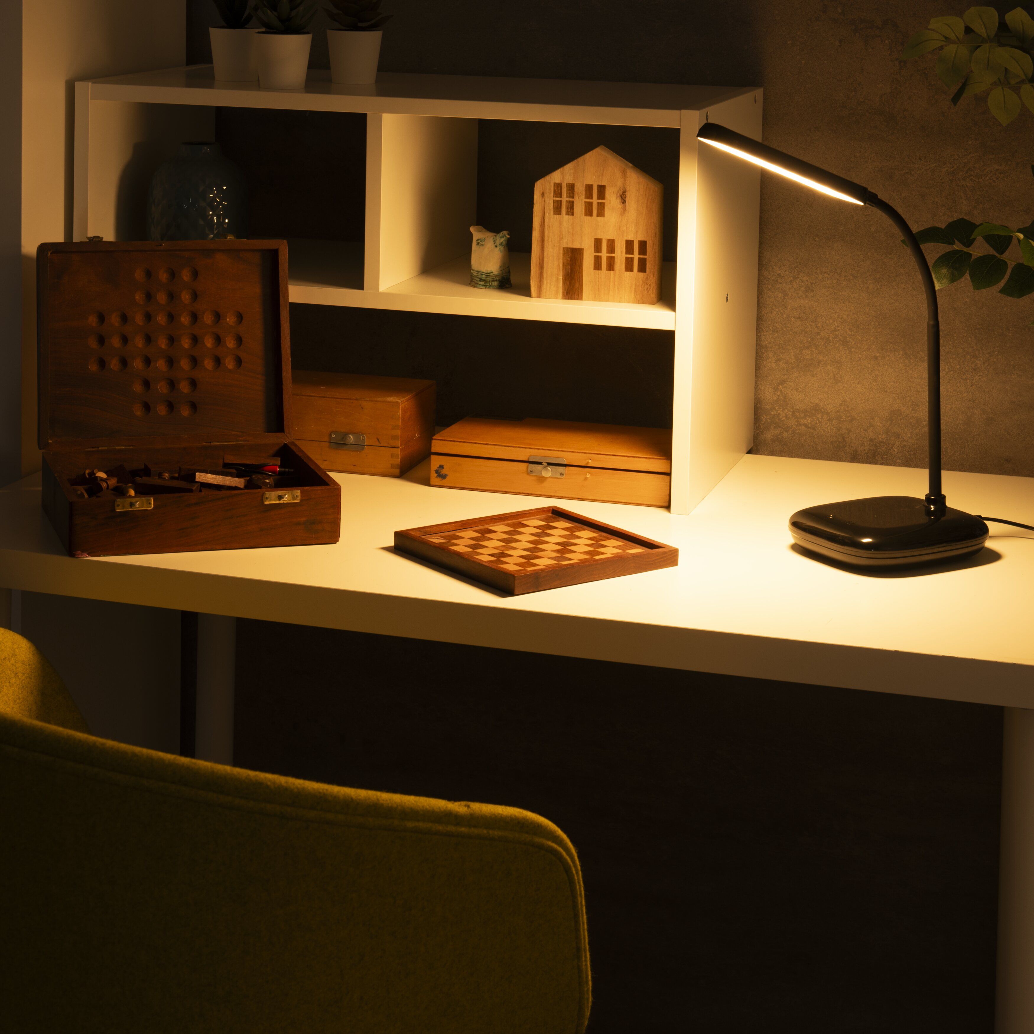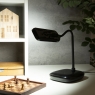 Подовжена робоча панель рівномірно освітлює поверхню столу, а рухлива секція дає змогу налаштовувати кут нахилу світильника для точного спрямування світла. Корпус виконано в сучасному мінімалістичному стилі, опорна частина має сенсорні елементи керування.