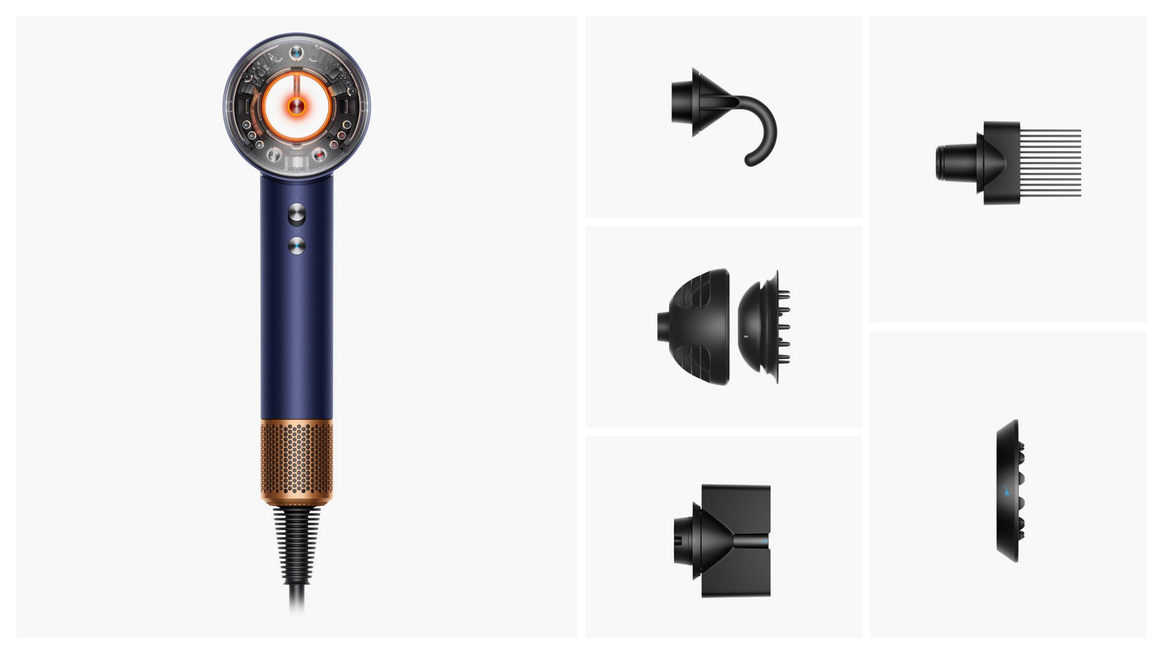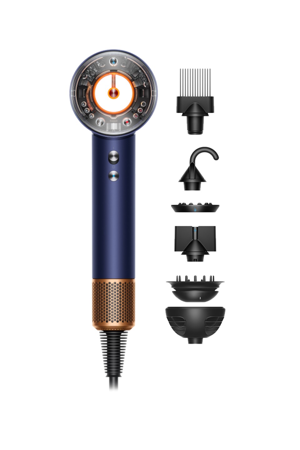 Dyson Supersonic Nural HD16 у кольорі Prussian Blue/Rich Copper — це розумний фен для побутового використання, який поєднує потужність 1600 Вт та точний контроль тепла. Прилад має три швидкості повітря та чотири режими нагріву. Температури розподілені так: приблизно 100 °C для швидкого висушування та укладання, 80 °C для повсякденної сушки, 60 °C для більш м’якого потоку з розсіюванням і 28 °C для постійного холодного повітря. Окрема кнопка Cold shot дає змогу охолодити й зафіксувати укладку.