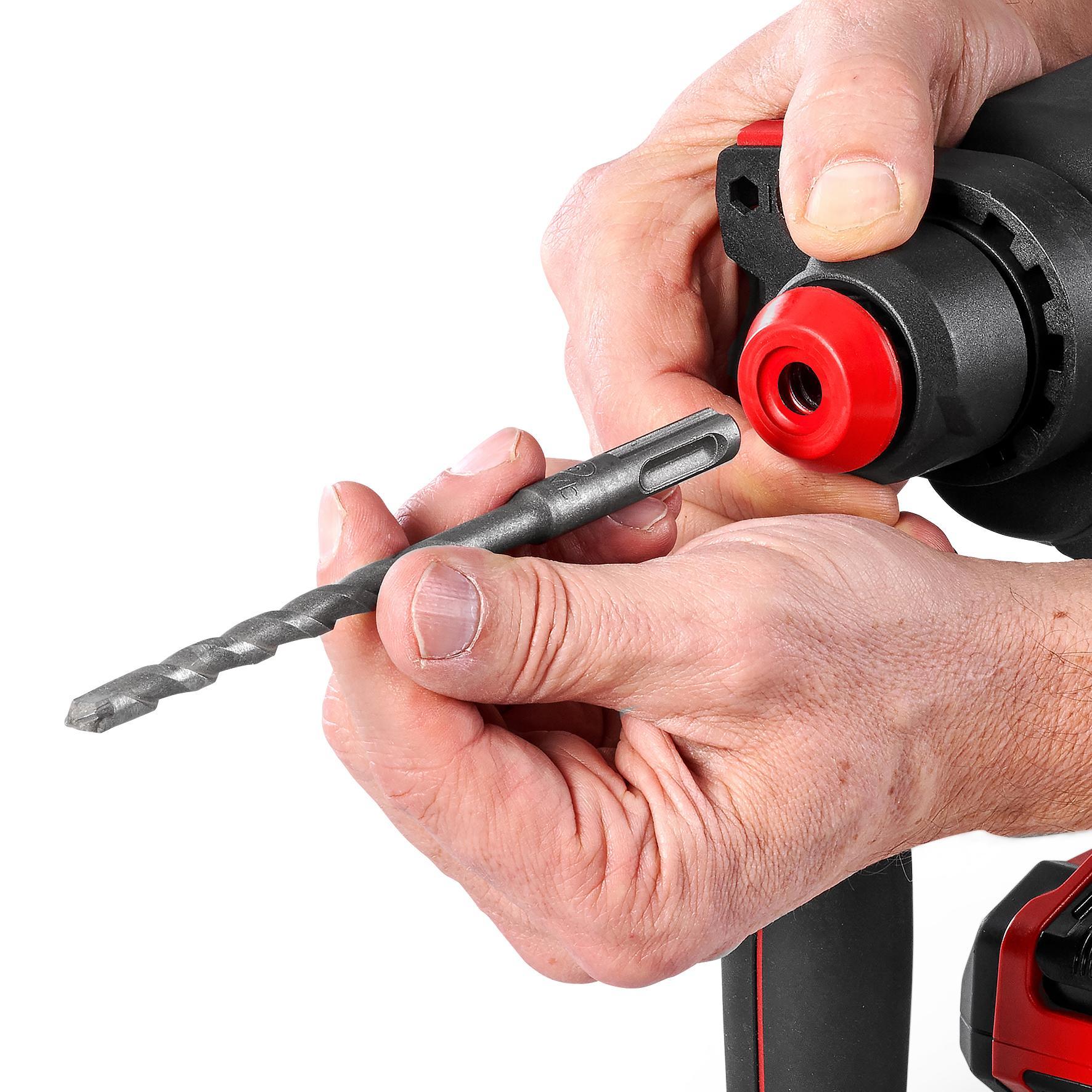 Патрон SDS-Plus з напівавтоматичним механізмом дає можливість швидко замінювати бурові та довбальні аксесуари без застосування ключів. Електронне регулювання швидкості дозволяє адаптувати роботу перфоратора до матеріалу та глибини обробки. Металевий обмежувач глибини свердління плавно регулюється, забезпечуючи точність робіт. LED-підсвічування освітлює робочу зону та підвищує видимість у затемнених місцях.