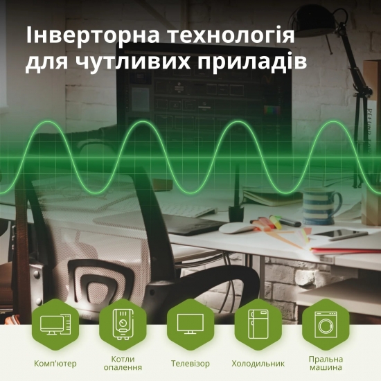 Забезпечує стабільну вихідну напругу правильної синусоїдальної форми, що підходить для надійної роботи чутливої електроніки.