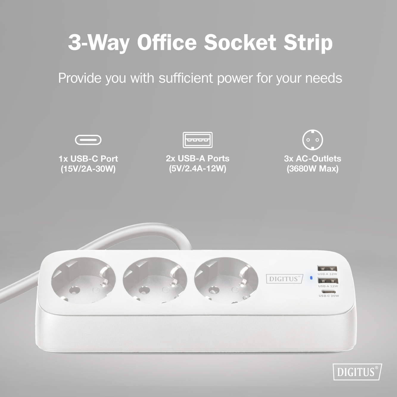 Опис Блок розеток DIGITUS Office, 3xSchuko, 2xUSB-A, 1xUSB-C, 16A, 1.5м, вилка Schuko, білий