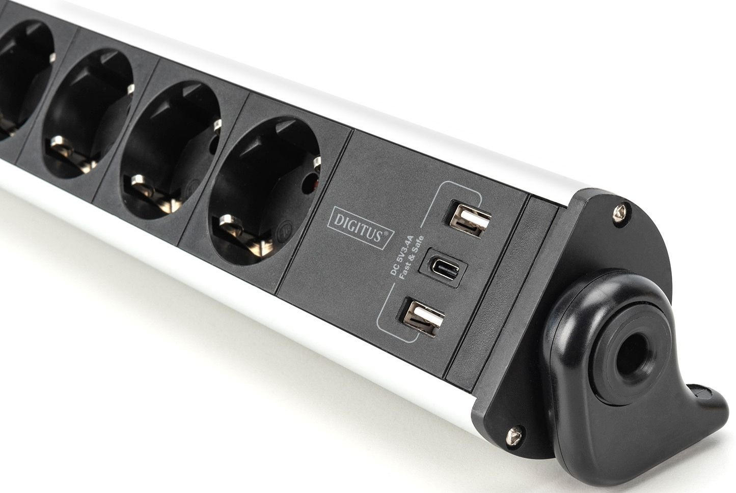 Блок розеток DIGITUS Office DA-70624 поєднує мережеві розетки та USB-порти в одному компактному корпусі. Шість розеток Schuko з кутовим розташуванням дозволяють зручно підключати різні типи вилок. Три USB-порти забезпечують заряджання мобільних пристроїв без окремих адаптерів. Алюмінієвий корпус доповнює сучасний вигляд робочого простору. Вбудований вимикач підвищує зручність щоденного використання.