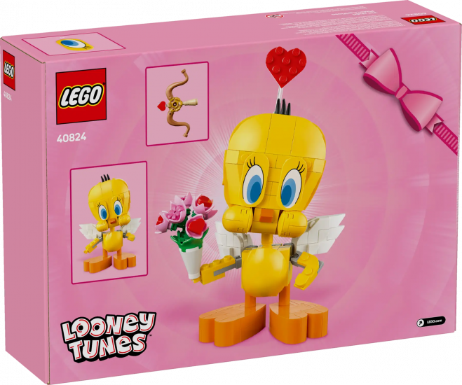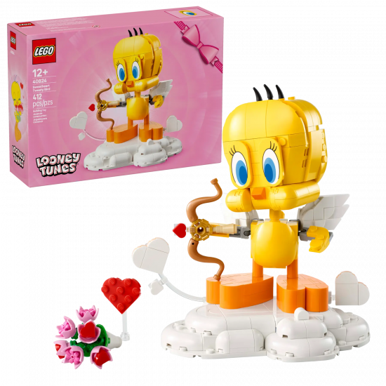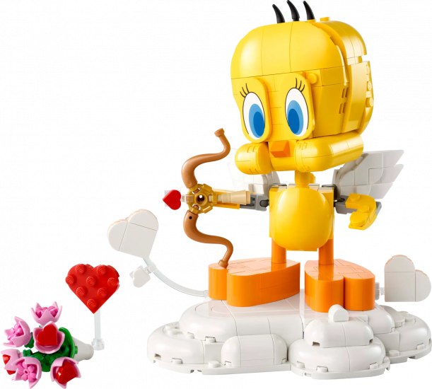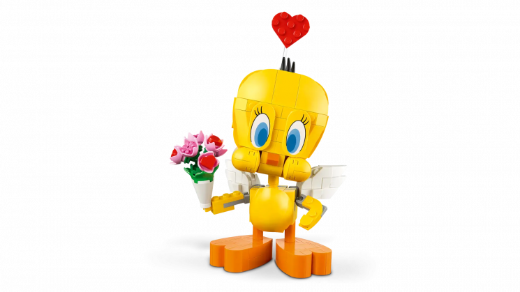 Створіть образ Твіті як Купідона, розмістивши його на хмарі за допомогою аксесуарів у вигляді лука та стріл. Або ж подаруйте йому букет квітів і помістіть серце над його головою, щоб показати його романтичну сторону. Фігурка має безліч рухомих деталей, таких як голова, крила, хвіст і лапи Твіті. Завдяки привабливим аксесуарам цей набір LEGO створює виставковий елемент, який обов'язково змусить серця тріпотіти.