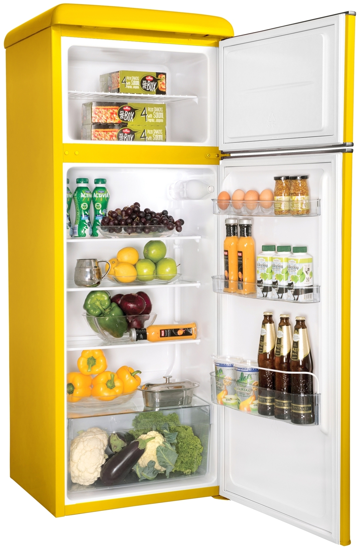 Холодильник Snaige FR24SM-PRDH0E — це поєднання класичного ретро-стилю та сучасних технічних рішень. Модель є окремостоячою, оснащена верхньою морозильною камерою та виконана в яскравому жовтому кольорі з декоративними дверними планками зі срібною гальванічною металізацією. Корисний об’єм холодильника становить 209 л, з яких 162 л припадає на відділення для свіжих продуктів і 47 л — на 4-зіркову морозильну камеру.