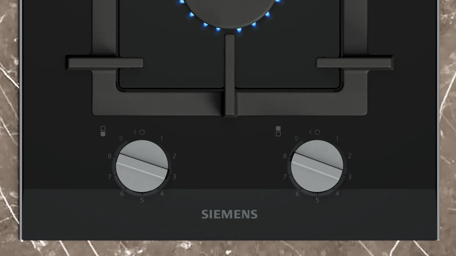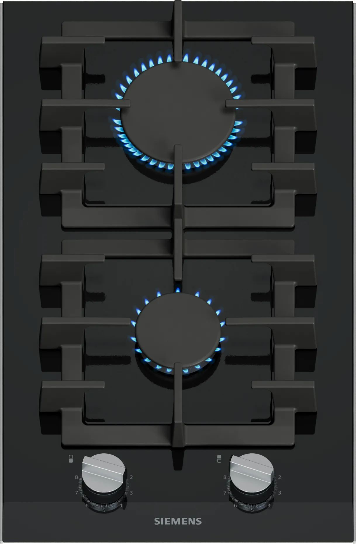 Газова варильна поверхня Siemens формату Domino оснащена двома газовими конфорками на склокерамічному чорному склі. Технологія stepFlame з дев’ятьма рівнями полум’я дає змогу точніше регулювати нагрів, окремі чавунні решітки забезпечують стійкість посуду, а термоелектричний захист і газ-контроль автоматично перекривають подачу газу у разі згасання полум’я. Знімні металеві ручки та гладка склокерамічна поверхня спрощують очищення.