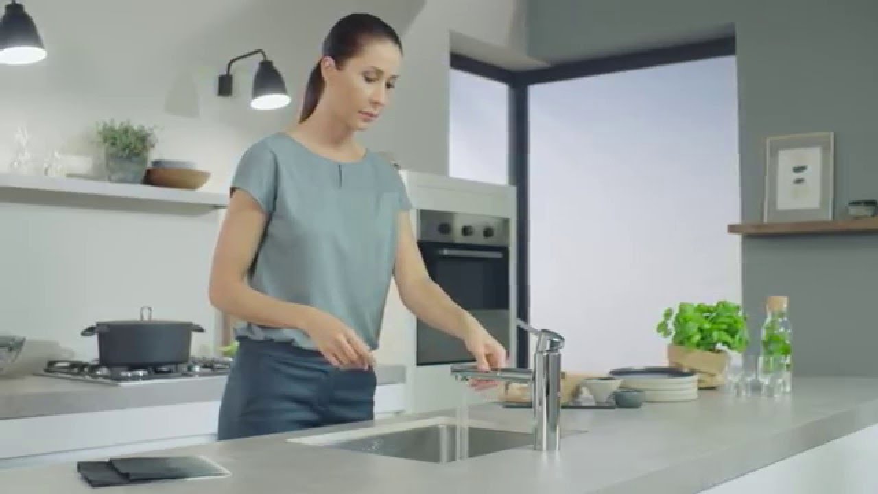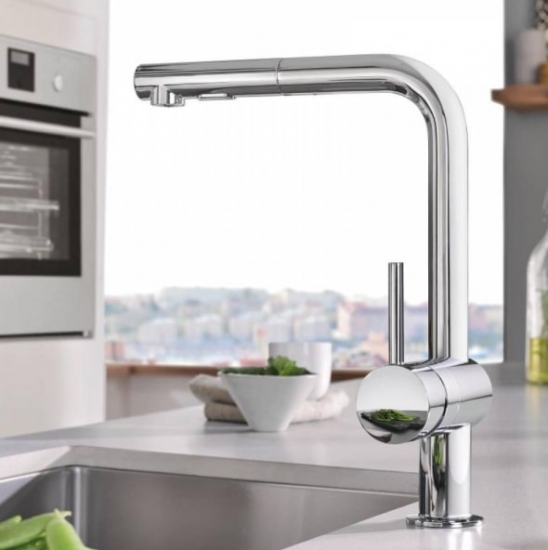 Змішувач для кухні Grohe Vento оснащений високим L-виливом із повним обертанням, що зручно для роботи з великим посудом. Висувна металева лійка підтримує два режими подачі води – ламінарний та душовий, з автоматичним поверненням до стандартного струменя після вимкнення. Керамічний картридж забезпечує плавне керування напором і температурою. Вбудований зворотний клапан підвищує безпеку водопостачання. Система швидкого монтажу спрощує встановлення.