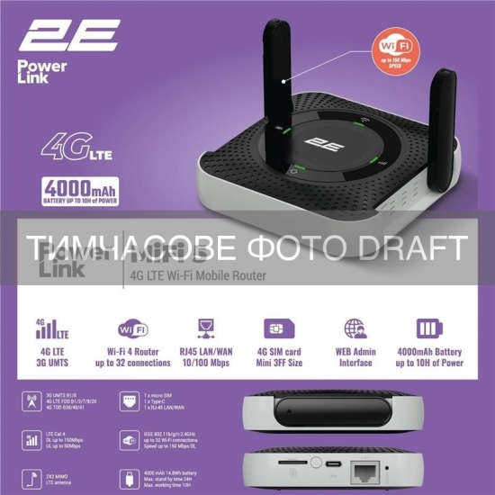 | Максимальна швидкість з'єднання | 150 Мбіт/с Мбіт/с під час приймання даних, до 50 Мбіт/с під час відправлення даних/ WCDMA: до 21 Мбіт/с під час приймання даних, до 5,76 Мбіт/с під час відправлення даних/ WiFi 4 (802.11n) 2,4 ГГц до 150 Мбіт/с |