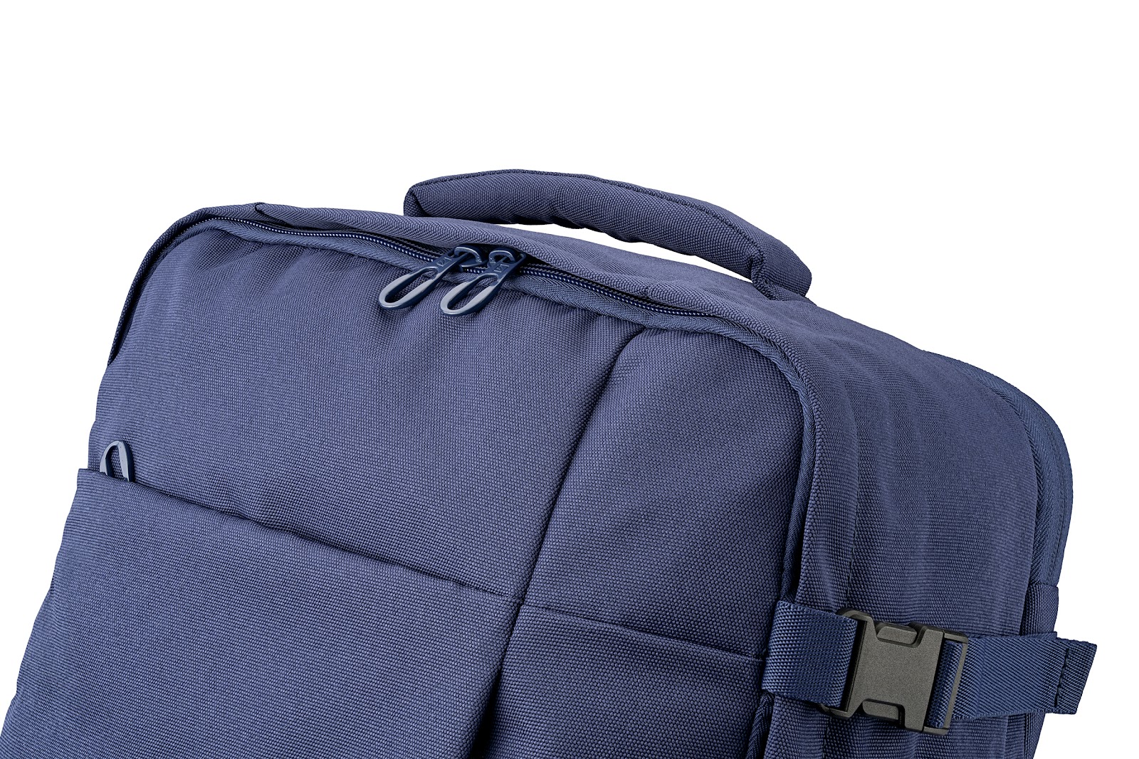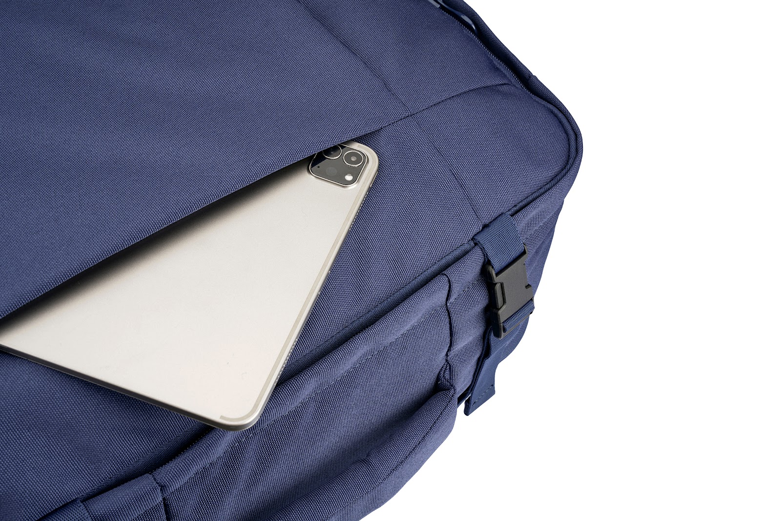 Рюкзак має просторе головне відділення для одягу та дорожніх аксесуарів з притискними пасками. Окремий відсік для ноутбука діагоналлю до 17–18" розміщений ближче до спини для зручного доступу та збалансованого навантаження. Дві передні кишені використовуються для впорядкування дрібних речей у дорозі. Усередині передбачений вбудований тримач для AirTag для контролю місця перебування багажу. У спинку інтегрована прихована кишеня для зберігання важливих предметів. Пасок кріплення на телескопічну ручку валізи спрощує пересування в аеропортах. Бігунки блискавок оснащені вушками для використання навісного замка. Бокові регульовані ремінці з фастексами дають змогу змінювати об’єм рюкзака. Дві міцні ручки зверху та збоку полегшують перенесення і завантаження.