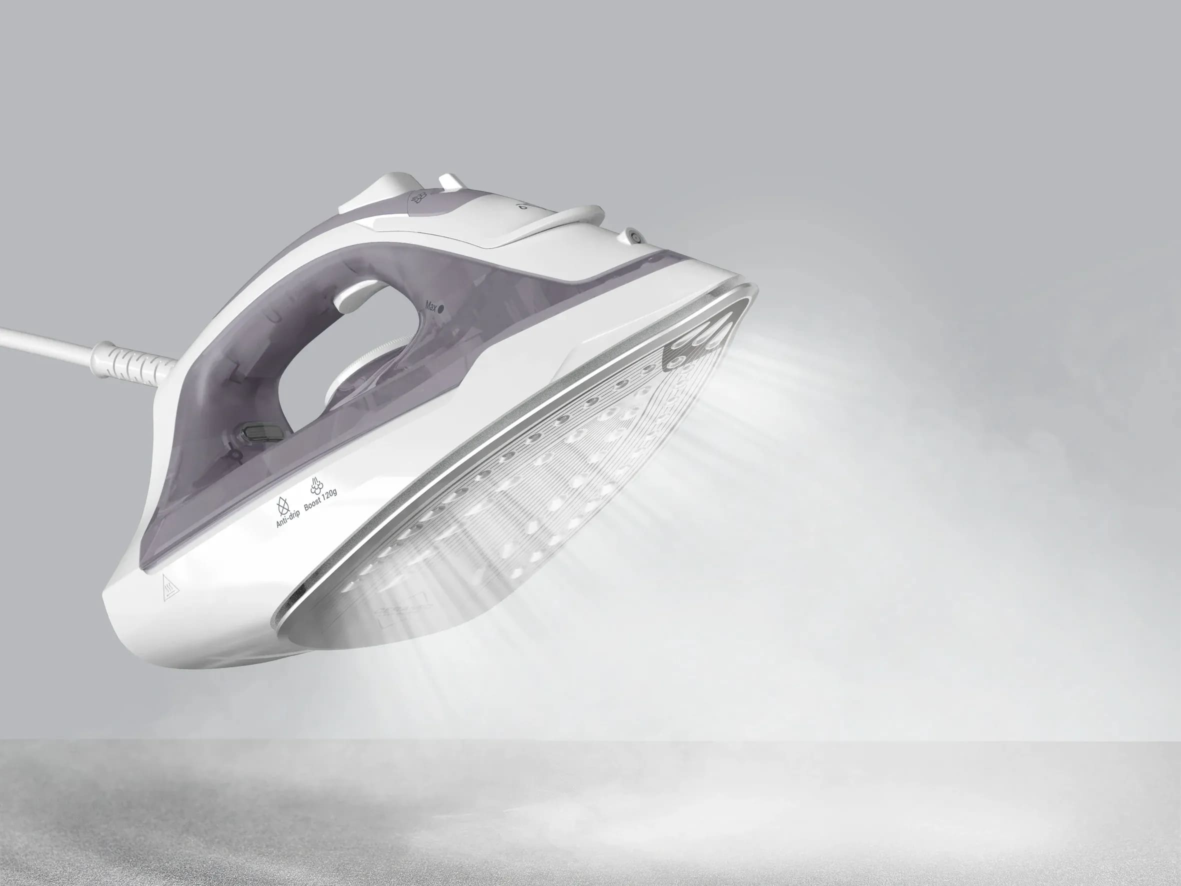 Праска Tefal Virtuo 30 створена для щоденного догляду за одягом і домашнім текстилем. Потужність 2000 Вт дає змогу швидко вийти на робочу температуру — орієнтовно за 30 секунд. Постійна подача пари до 27 г/хв підтримує рівномірне зволоження тканини, а паровий удар 120 г/хв застосовується для більш жорстких складок і щільних матеріалів.