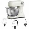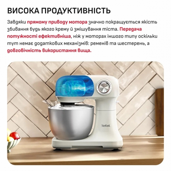 Двигун потужністю 500 Вт працює через прямий привід, що покращує передавання потужності та забезпечує стабільність навіть під час замішування густих мас. Дванадцять швидкостей і імпульсний режим дають змогу точно керувати процесом залежно від рецепта. У комплект входять три основні насадки — вінчик, гак для тіста та насадка для замішування.