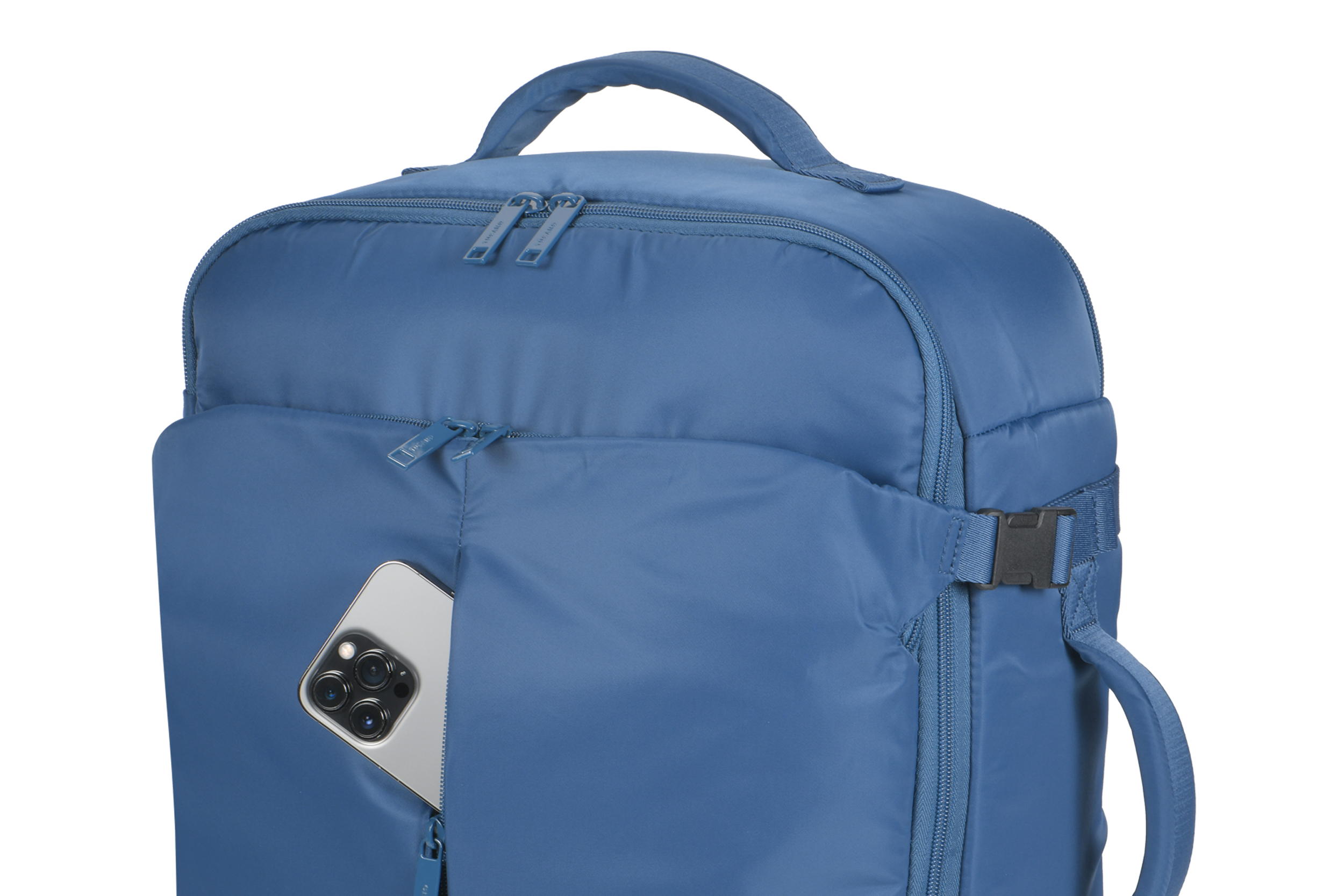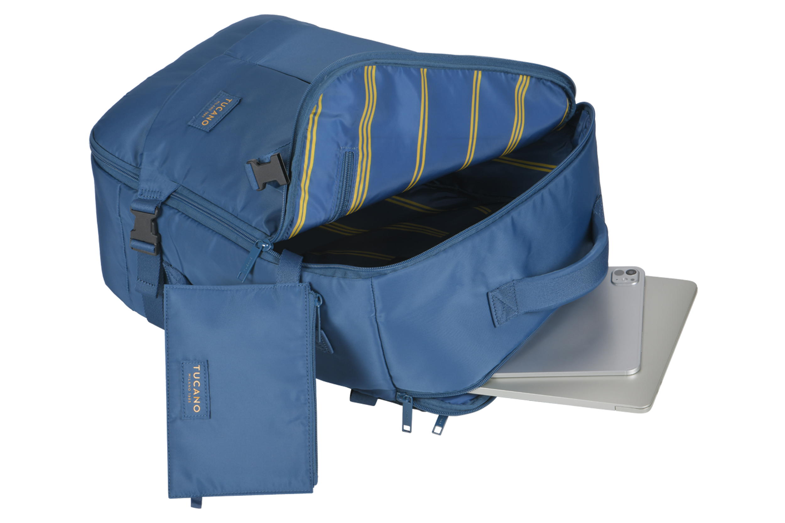 Основне відділення має великий об’єм для одягу, аксесуарів і дорожніх речей. Усередині передбачено дві вбудовані кишені на блискавках, одна з яких оснащена тримачем для AirTag. У цьому ж відділенні розміщений знімний чохол для паспорта та документів. На передній панелі розташовані дві зовнішні кишені — вертикальна та горизонтальна. У задній стінці передбачена прихована кишеня для важливих предметів. Окреме м’яке відділення призначене для ноутбуків до 17" або MacBook Pro 16" і має додаткову внутрішню кишеню на блискавці. Спинка та внутрішні поверхні плечових ременців виконані з дихаючої сітчастої тканини. Дві ручки для перенесення та чотири бічні ремінці з фастексами забезпечують зручність транспортування й регулювання об’єму.
