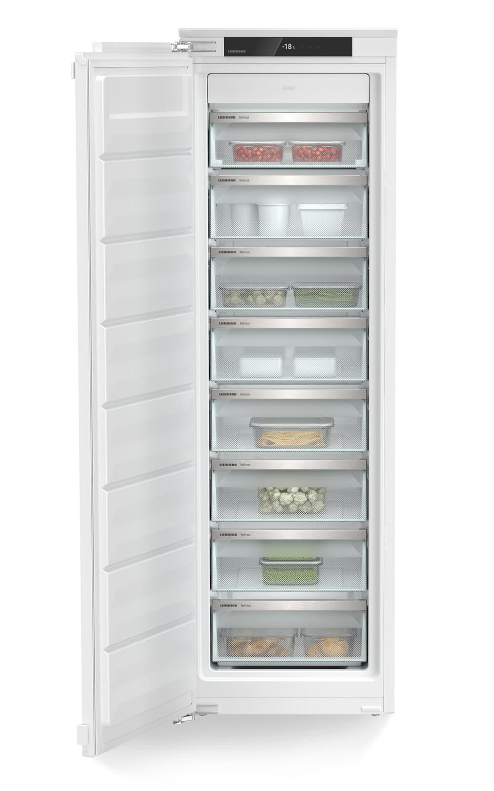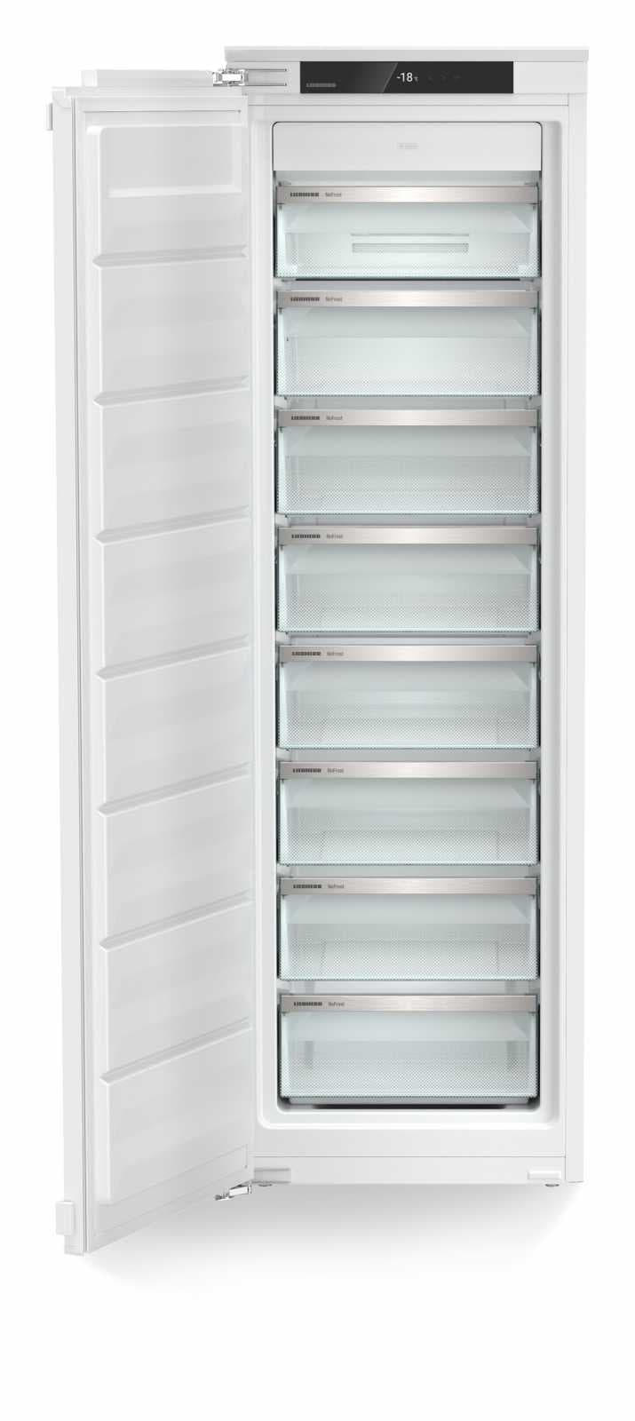Морозильна камера призначена для вбудованого встановлення в нішу заввишки 177 см і гармонійно інтегрується в кухонні меблі. Корисний об’єм 209 літрів розподілений між вісьмома відділеннями зі скляними полицями, що полегшує сортування продуктів. Динамічна система охолодження разом з автоматичним розморожуванням формує стабільний температурний режим без накопичення льоду. Сенсорне керування розміщене за дверима та доповнене внутрішньою цифровою індикацією температури. Функція швидкого заморожування за часом орієнтована на обробку значних обсягів продуктів. Передбачені звукові сигнали відкритих дверей і несправностей, а також захист від дітей. Камера зберігає холод до 14 годин за відсутності електроживлення.