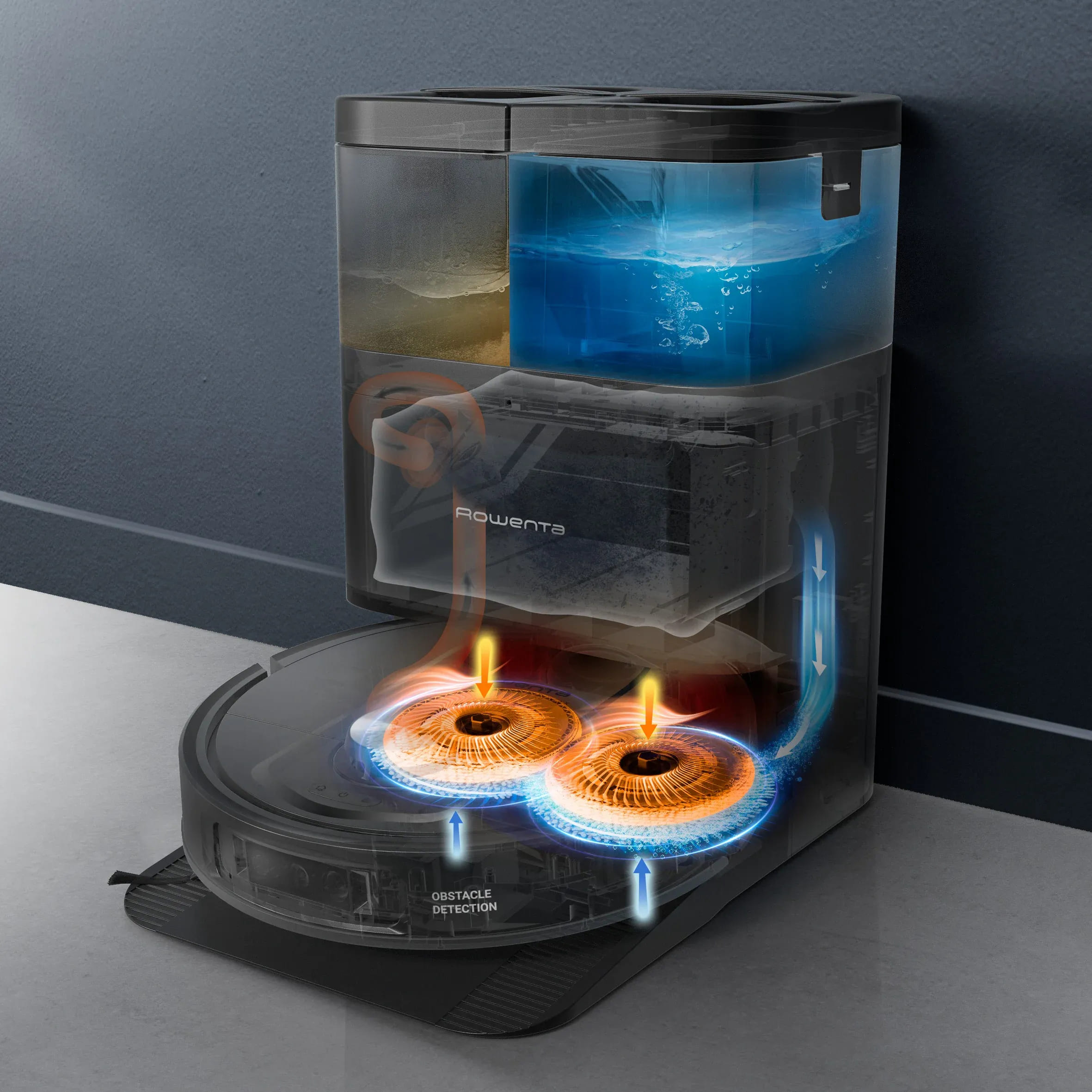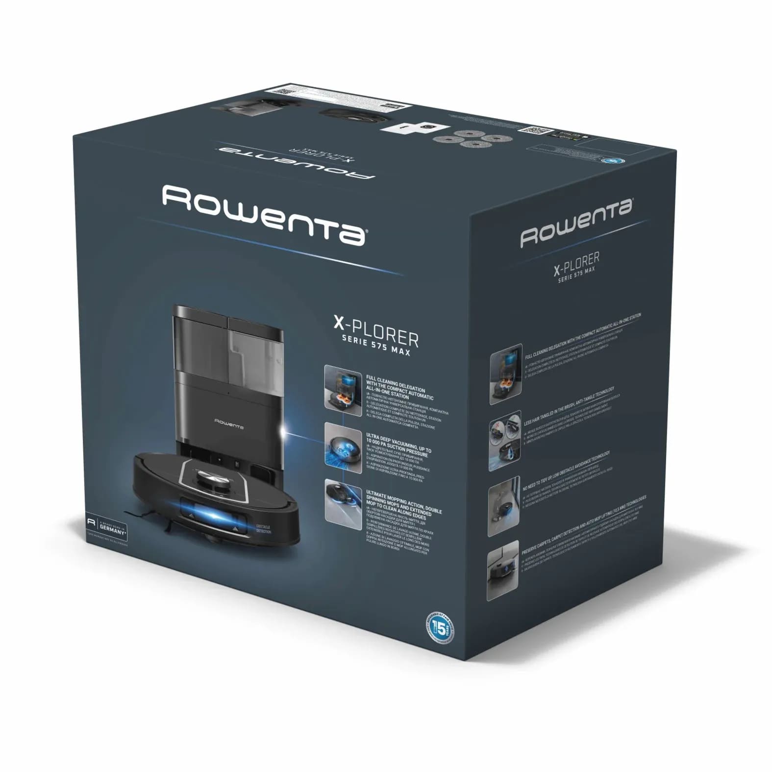 Робот-пилосос Rowenta X-Plorer Serie 575 Max Standard поєднує сухе прибирання та миття підлоги завдяки подвійним обертовим мопам. Потужність всмоктування до 10 000 Па дозволяє збирати дрібний пил і більші частинки, а антизаплутувальна система зменшує намотування волосся на щітку під час роботи.