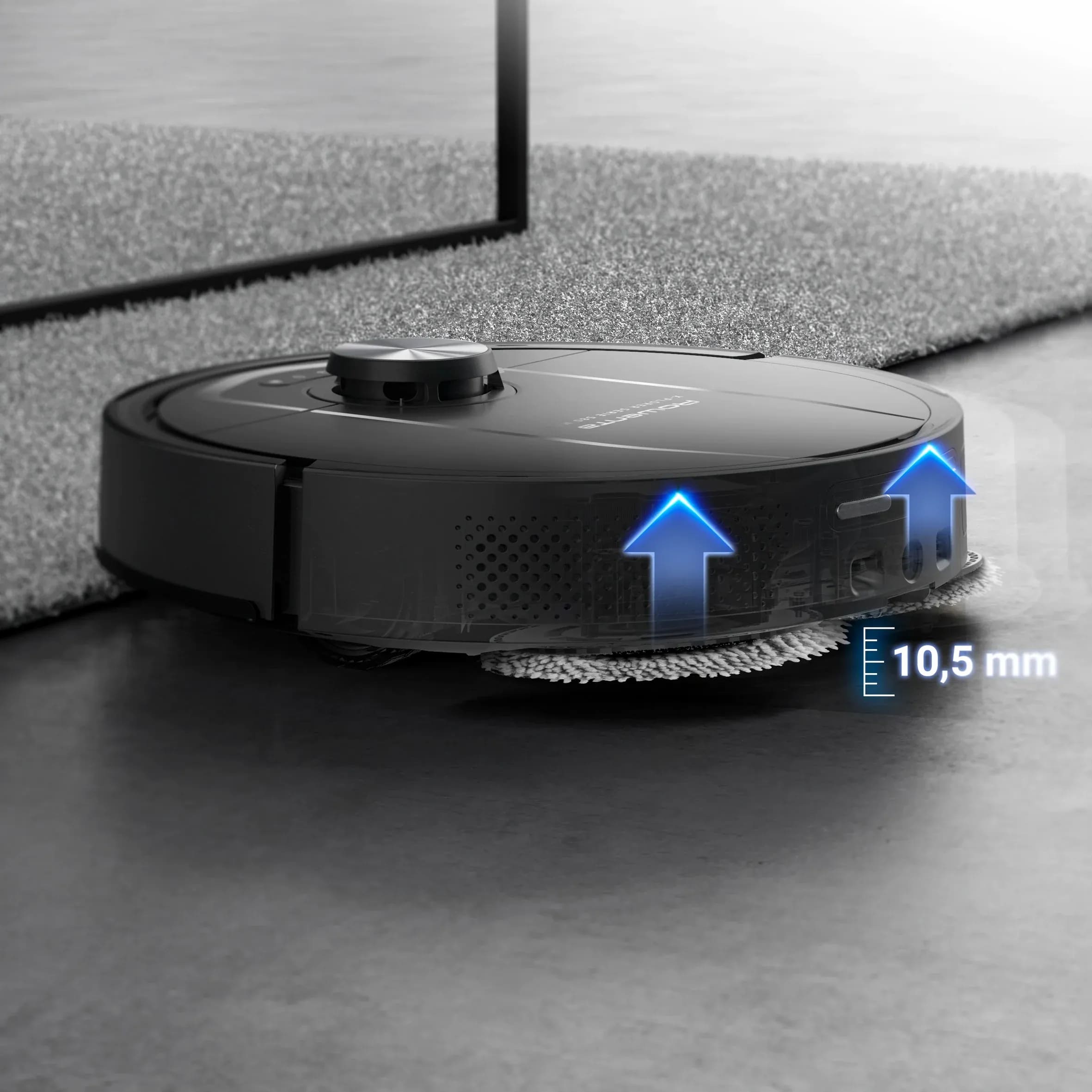 Навігація LiDAR 360° забезпечує побудову карти приміщення та методичний маршрут руху. Робот розпізнає килимові покриття і піднімає мопи до 10,5 мм під час заїзду на килим, щоб зменшити зволоження ворсу. Також він виявляє перешкоди й об’їжджає їх, тому прибирання проходить без постійного контролю.
