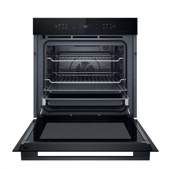 Модель оснащена електронною сенсорною системою керування та камерою на 73 літри, що підходить для приготування великих порцій. П’ять рівнів напрямних дозволяють організувати простір для різних страв одночасно. Конвекція сприяє рівномірному розподілу тепла, а піролітичне очищення FlexiClean перетворює забруднення на попіл без ручного чищення. Автоматичні програми 6th SENSE адаптують параметри готування під тип страви. Телескопічні напрямні на першому рівні підвищують зручність користування деком, а функції безпеки та таймер підтримують контроль процесу.