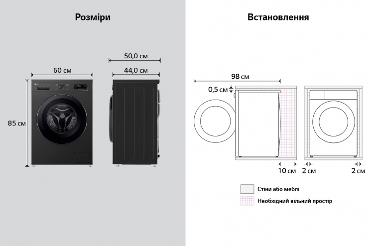 | Глибина | 44 см (50 см - глибина з зачиненими дверцятами; 98 см - глибина з відчиненими дверцятами) |