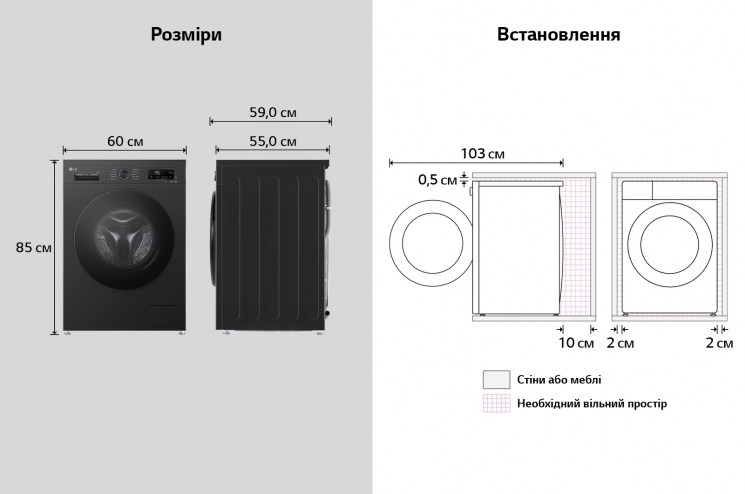 | Глибина | 55 см (59 см - глибина з зачиненими дверцятами; 103 см - глибина з відчиненими дверцятами) |