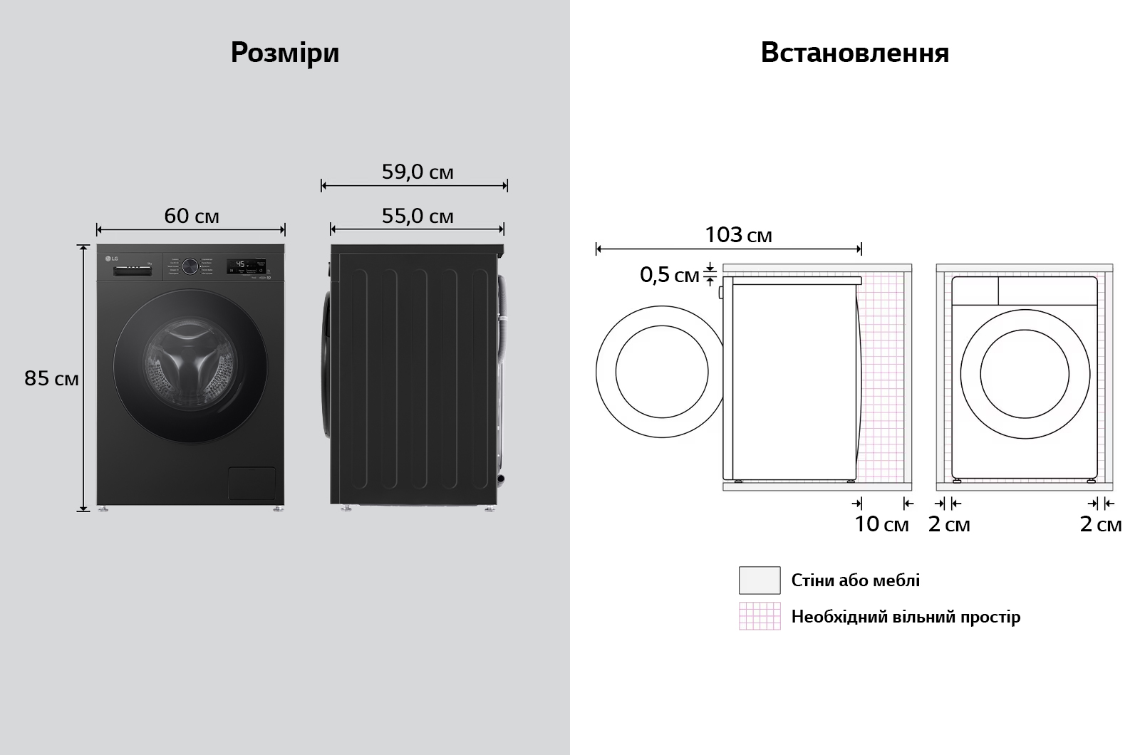| Можливість завантажити додаткові програми прання, що завантажуються через додаток LG ThinQ /(Одяг малюка, Дитячий одяг, Шкільна форма, Джинси, Спортивний одяг, Купальний костюм, Сезон дощів, Ковдра, Полоскання + Віджим, Одна річ, Мінімальний шум, Збереження кольору, Плями поту) | |