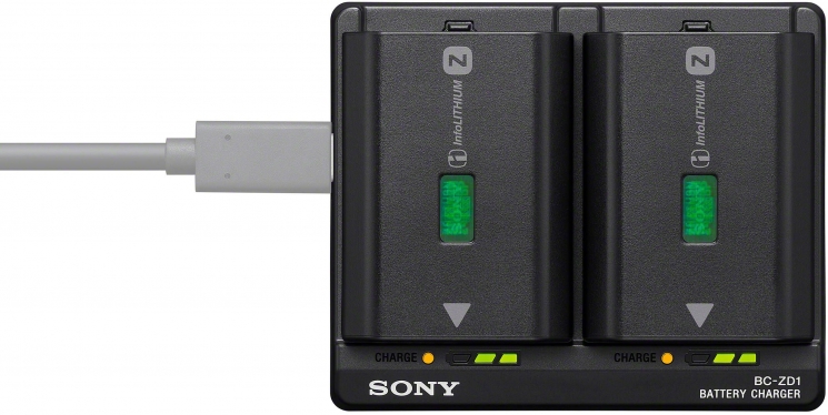 Зарядний пристрій Sony BC-ZD1B розроблений для заряджання акумуляторів NP-FZ100 через інтерфейс USB Power Delivery. Він дозволяє одночасно заряджати два акумулятори, що зручно під час інтенсивної фото- та відеозйомки. За умови підключення до USB PD-сумісного блока живлення потужністю від 30 Вт повний заряд досягається приблизно за 155 хвилин. Світлодіодні індикатори з п’ятьма рівнями інформують про стан заряду кожного акумулятора окремо. Компактний корпус із роз’ємом USB Type-C підходить для студійної та виїзної роботи.