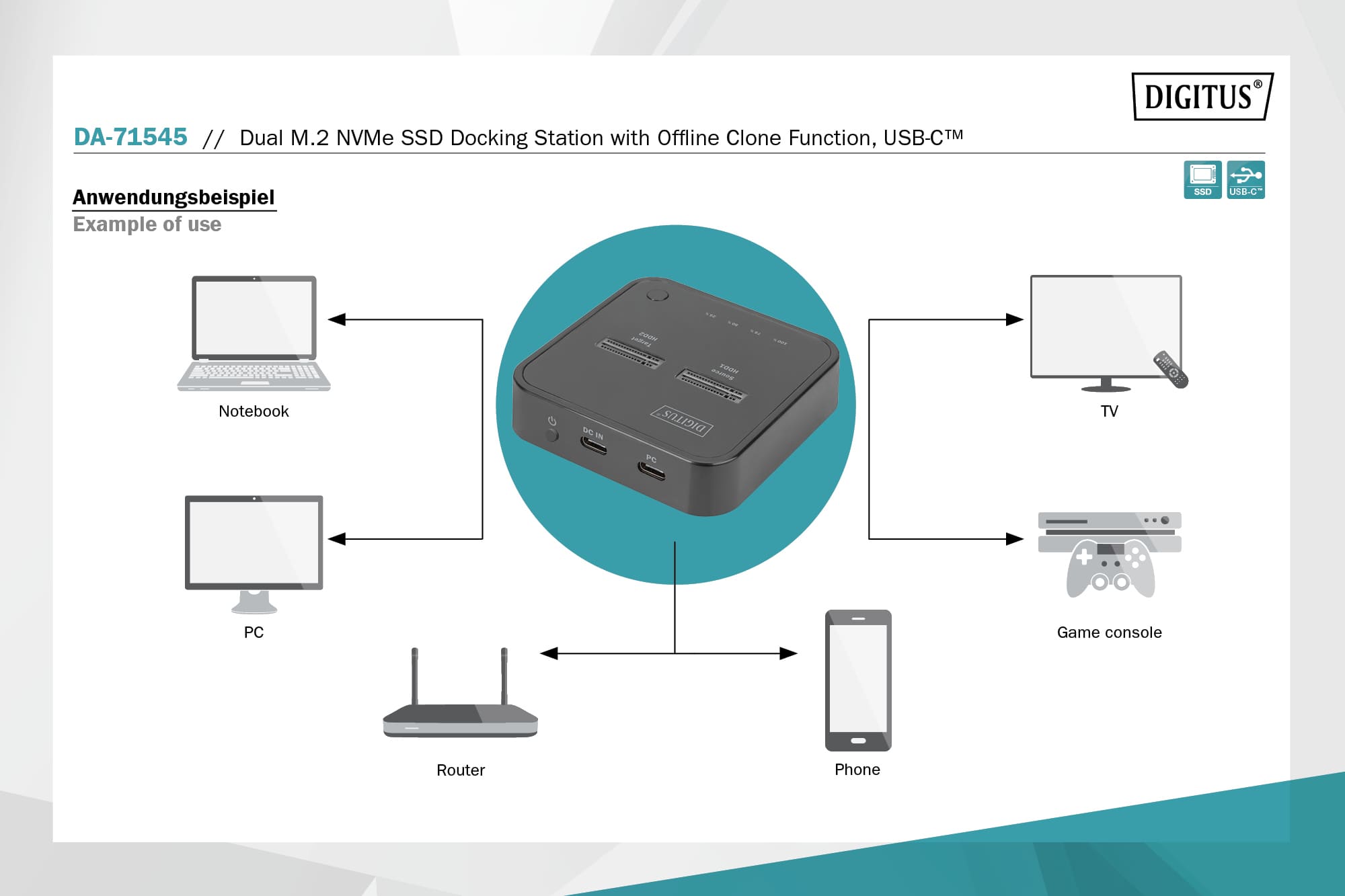 Подвійна док-станція DIGITUS Dual M.2 NVMe SSD USB Type-C 3.2 призначена для роботи з двома NVMe-накопичувачами формату M.2 та забезпечує швидке підключення через інтерфейс USB-C. Вона дозволяє одночасно використовувати два SSD та розширювати обсяг пам’яті підключених пристроїв, таких як ПК, ноутбуки, телевізори, ігрові консолі або маршрутизатори з підтримкою USB-C.