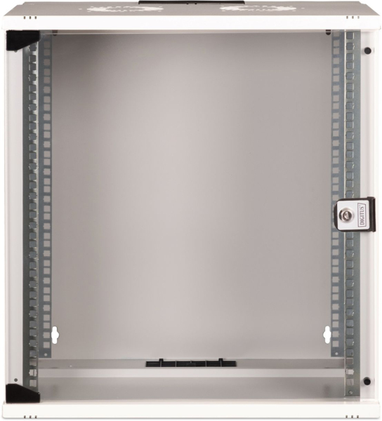 Настінна шафа DIGITUS 19” 9U SOHO PRO у світло-сірому виконанні створена для компактного розміщення мережевого обладнання. Скляні дверцята з кутом відкриття 200° забезпечують зручний доступ до внутрішнього простору. Усередині розміщені регульовані оцинковані рейки 19”. Кабельні вводи зверху та знизу допомагають впорядкувати інфраструктуру. Конструкція витримує навантаження до 60 кг.