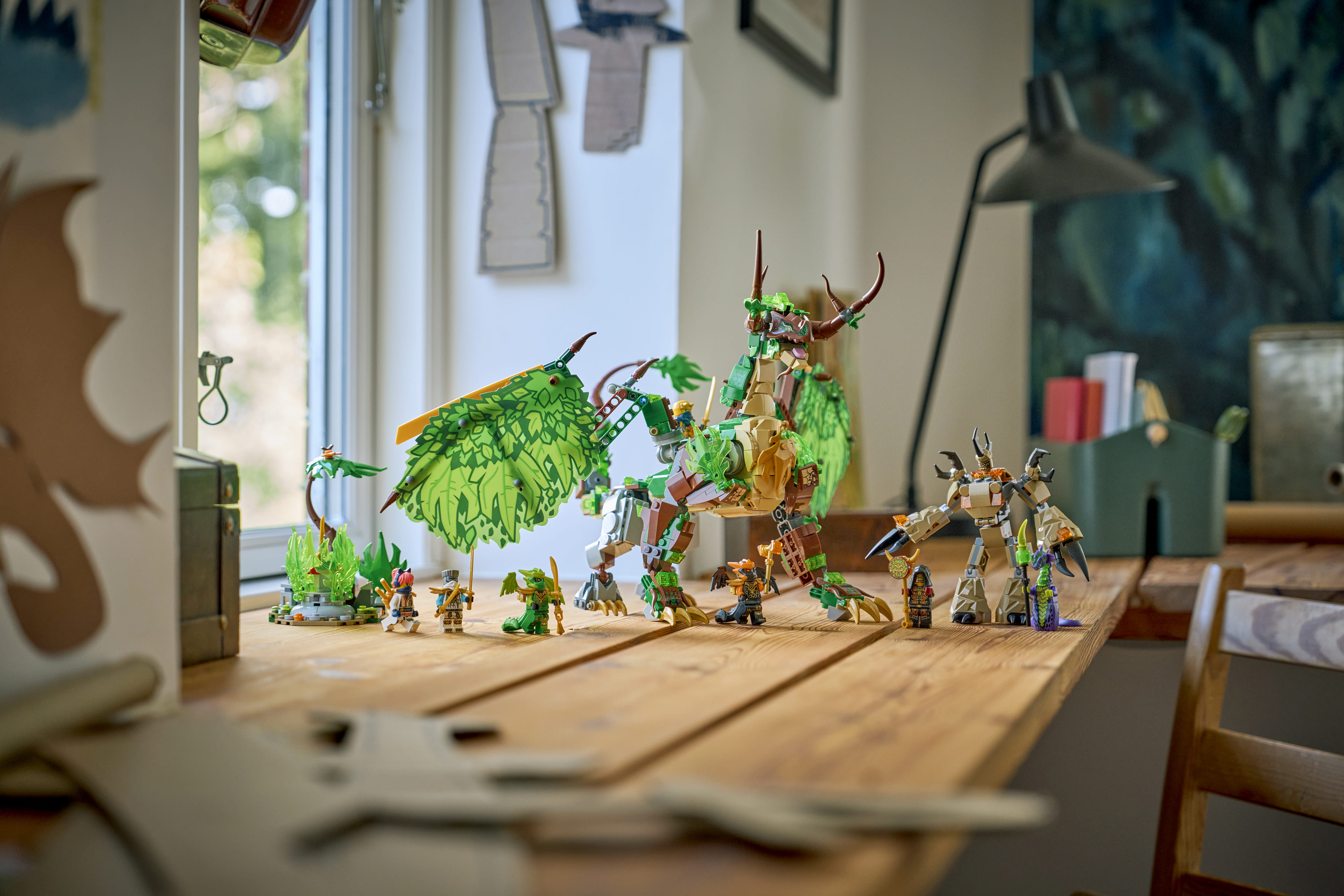 • ФІГУРКА-ДРАКОН З ПОСУДОМ – Зелений дракон може широко розправляти або складати крила, а також має рухому щелепу, голову, шию, ноги, щиколотки, кігті, хвіст та сідло для мініфігурки.
