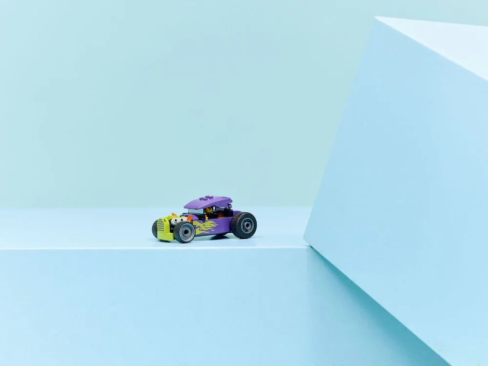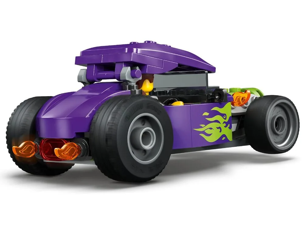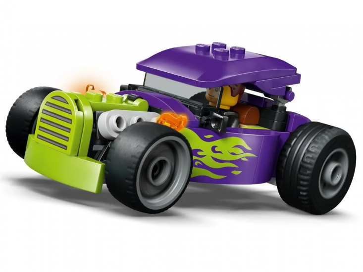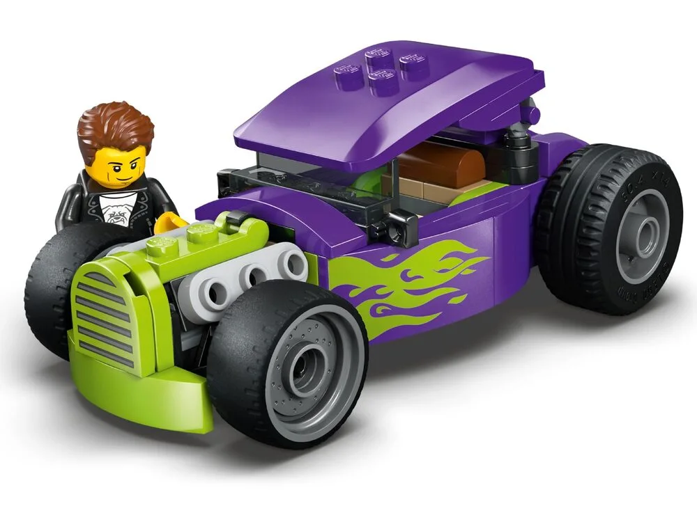 LEGO City Хотрод (60485) — це компактна та емоційна модель гоночного автомобіля для дітей від 5 років. Хотрод виконаний у стильній фіолетовій гамі з неоновим зеленим полум’ям на боках, має збільшені задні шини для агресивного вигляду, кабіну водія з підйомним дахом та деталізований салон.