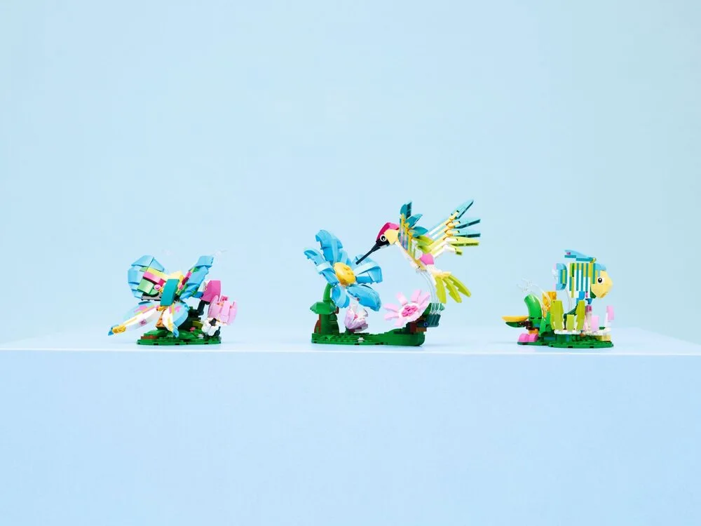 Перший варіант складання — колібрі з розкритими крилами в польоті. Фігурка встановлюється на підставку з квітами, що підкреслює легкість і рух. Другий варіант — метелик на квітковій підставці, який асоціюється з перетворенням і гармонією природи. Третя модель — тропічна рибка на підставці з підводними рослинами, що відкриває ігрові історії з підводного світу.