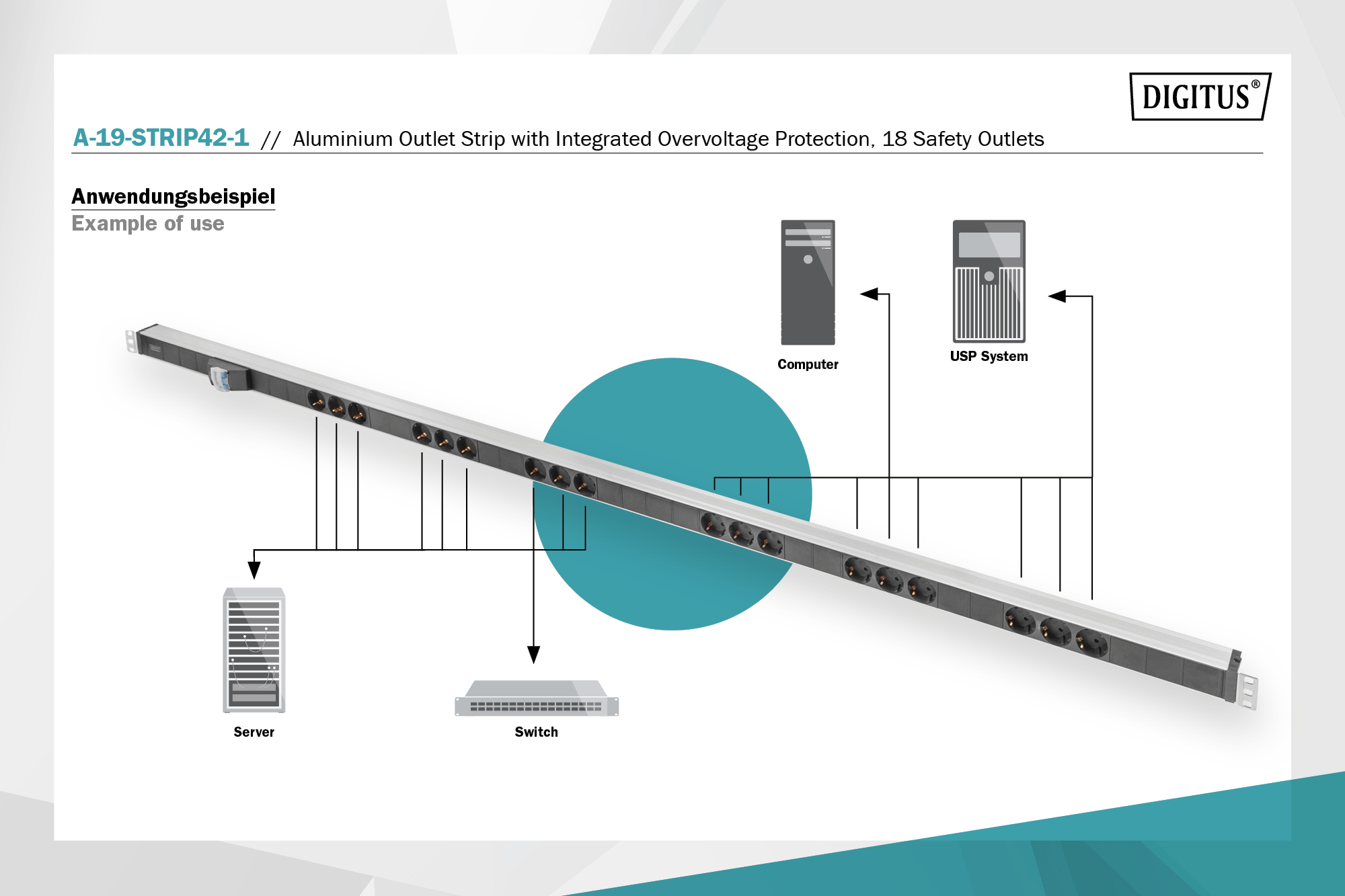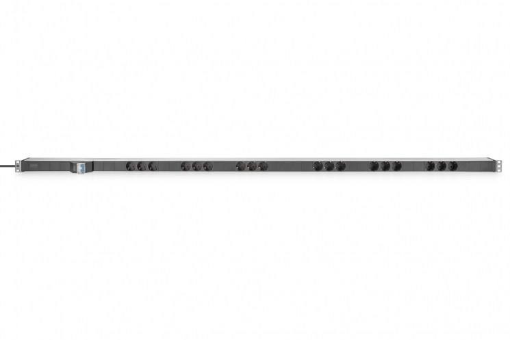 PDU DIGITUS використовується для централізованого розподілу електроживлення в стійках 19 дюймів. Вертикальне встановлення дозволяє розміщувати блок уздовж напрямних без зайняття корисного простору. Розетки Schuko, розташовані під кутом, забезпечують зручне підключення кабелів. Корпус з алюмінієвого профілю підходить для тривалої експлуатації. Вбудований автоматичний вимикач підвищує контроль над навантаженням.