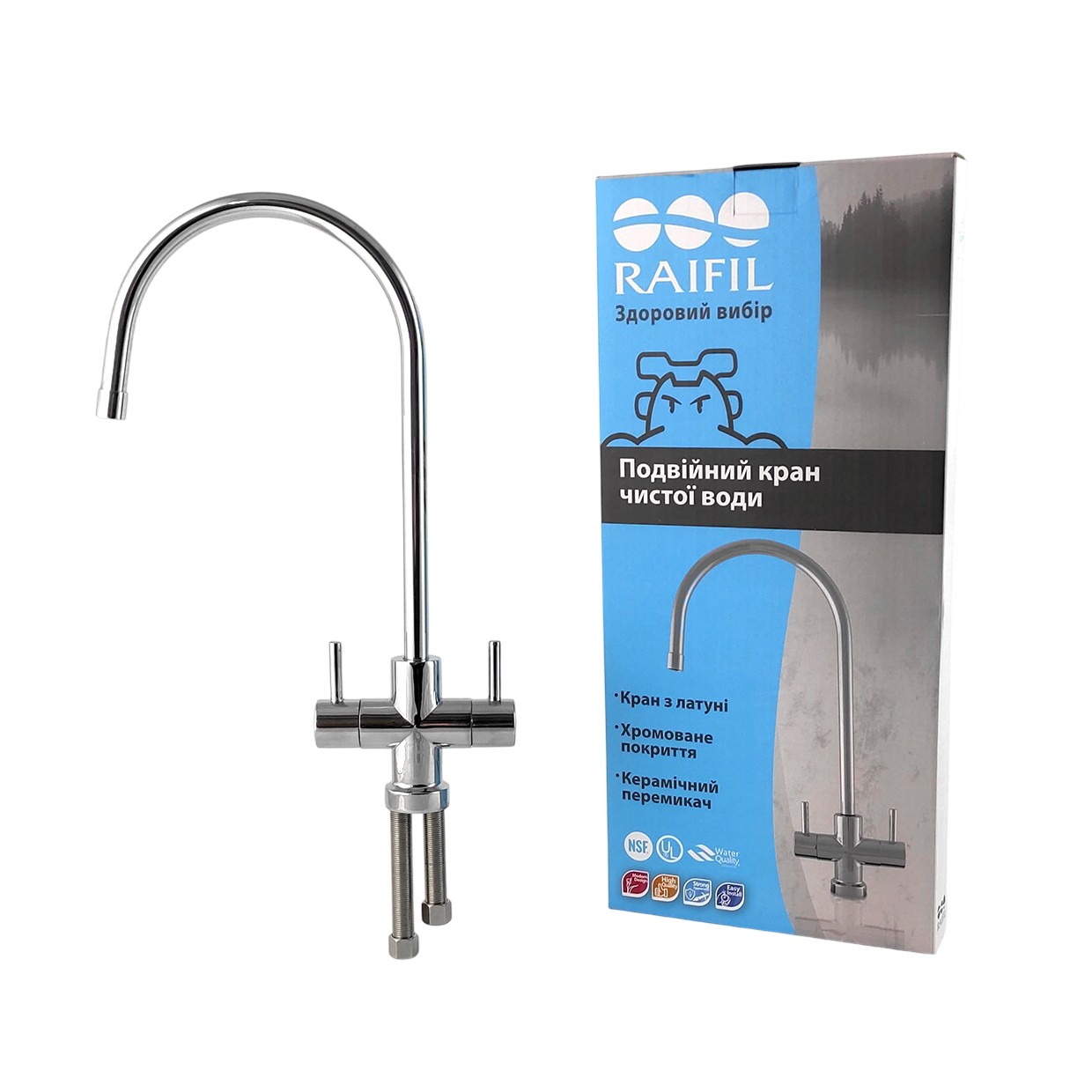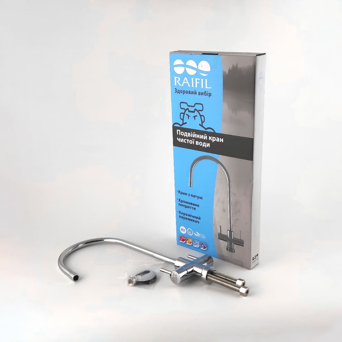 Кран чистої води F-09 Raifil Slim призначений для подачі очищеної води після побутових систем фільтрації. Виготовлений з латуні з хромованим покриттям та оснащений керамічним перемикачем. Монтується на кухонну мийку або стільницю. Підключається до систем очищення води через різьбове з’єднання 1/4".