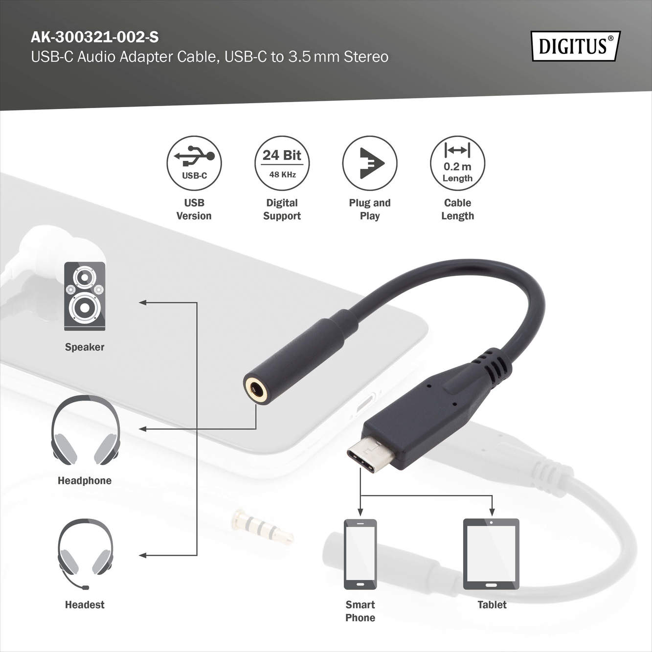 Аудио стереоадаптер DIGITUS USB-C >3,5 мм