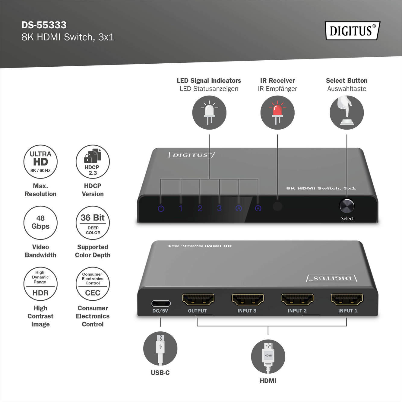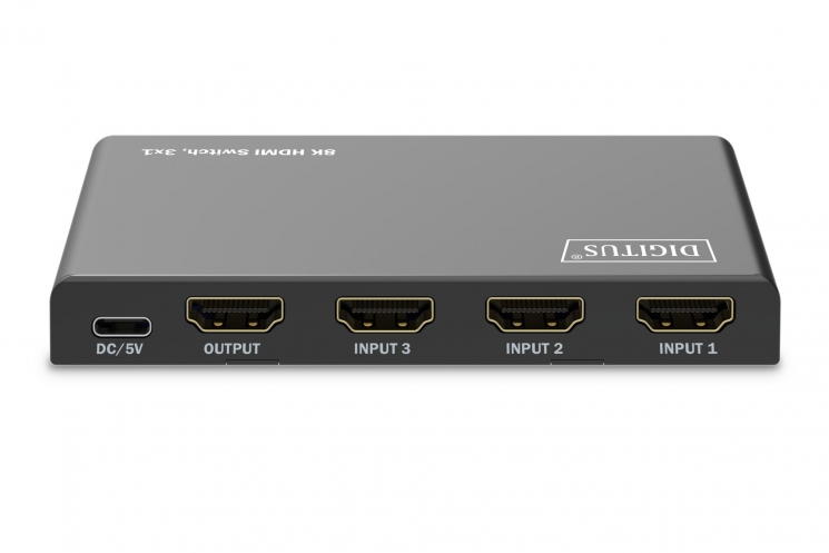 Відеокомутатор DIGITUS 5x1 UHD HDMI DS-55334 дозволяє підключити п’ять джерел 8K-сигналу до одного дисплея, використовуючи лише один HDMI-кабель до екрана. Пристрій підтримує роздільну здатність 8K@60 Гц з повним 4:4:4 та пропускною здатністю 48 Гбіт/с. Перемикання між джерелами відбувається за допомогою кнопки на корпусі, пульта ДК або автоматично при появі активного сигналу. Металевий корпус і підтримка HDR, HDCP 2.3, CEC забезпечують стабільну роботу в сучасних системах.