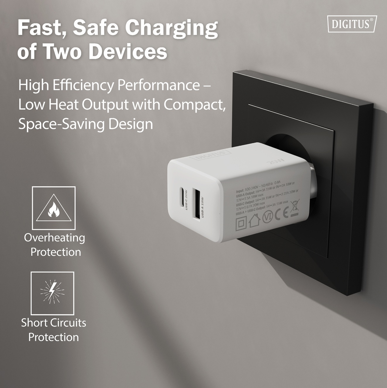 Опис Зарядний пристрій DIGITUS 1хUSB-C, 1хUSB-A, 20W