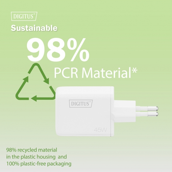 Опис Зарядний пристрій DIGITUS GaN 1хUSB-C, 1хUSB-A, 45W